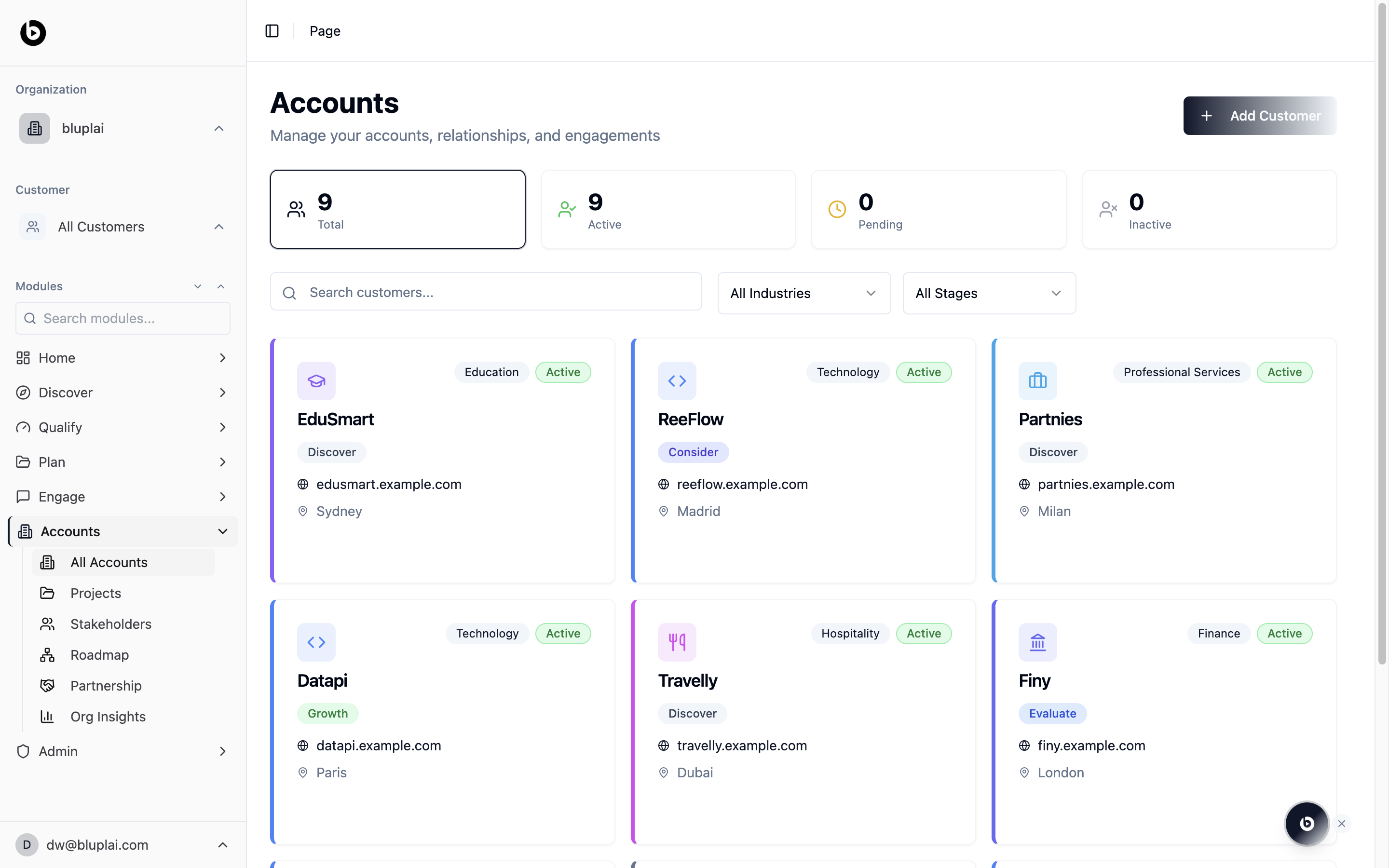 - Filter by stage to see which customers are still in Discover versus already in Growth.
