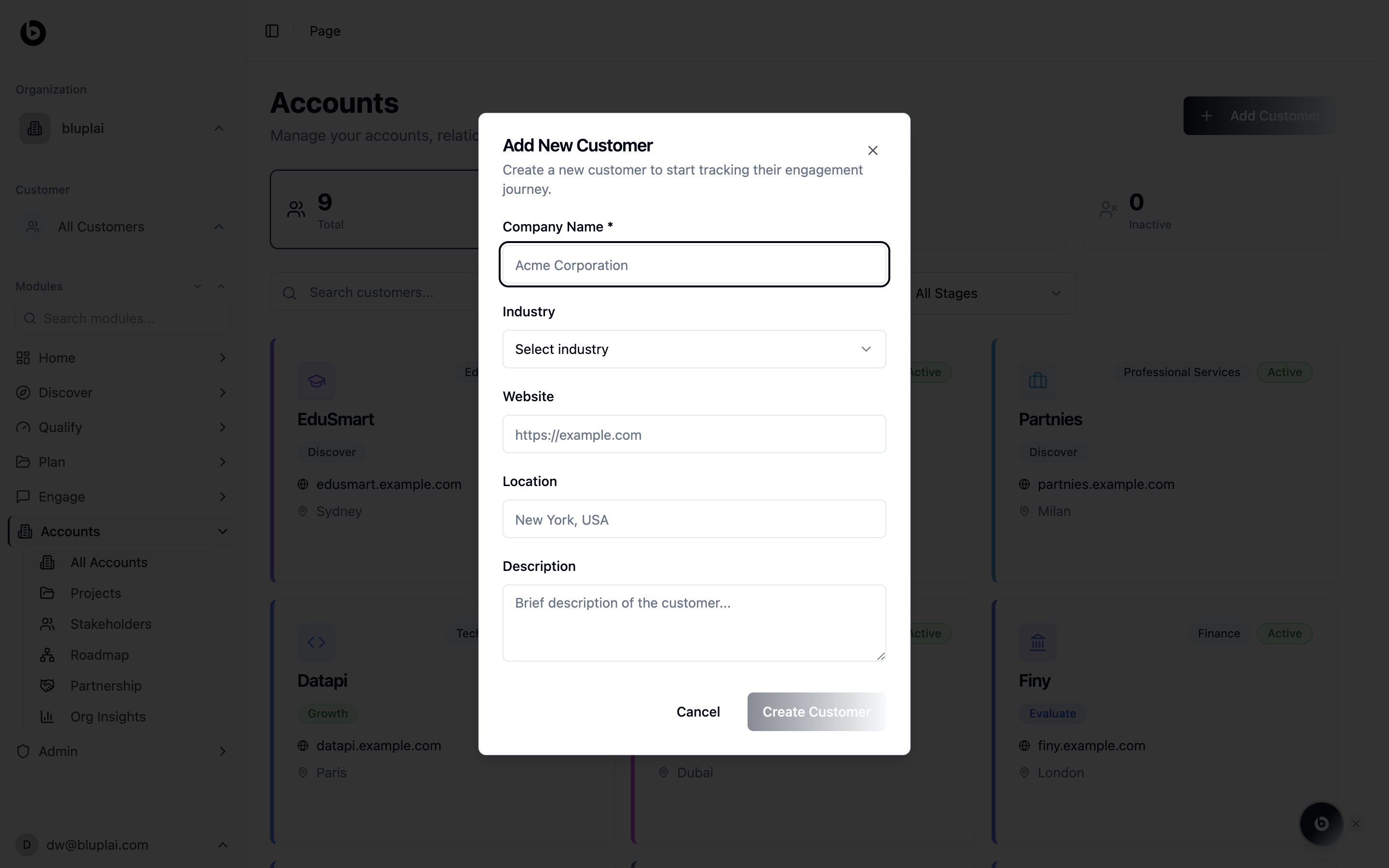 A customer is the root record in Accounts — everything else (projects, stakeholders, roadmap items, partnership context) hangs off it. Adding one sets up the container that collects engagement data over time, so the sooner you add a customer the sooner context starts accumulating against their record.How to add one