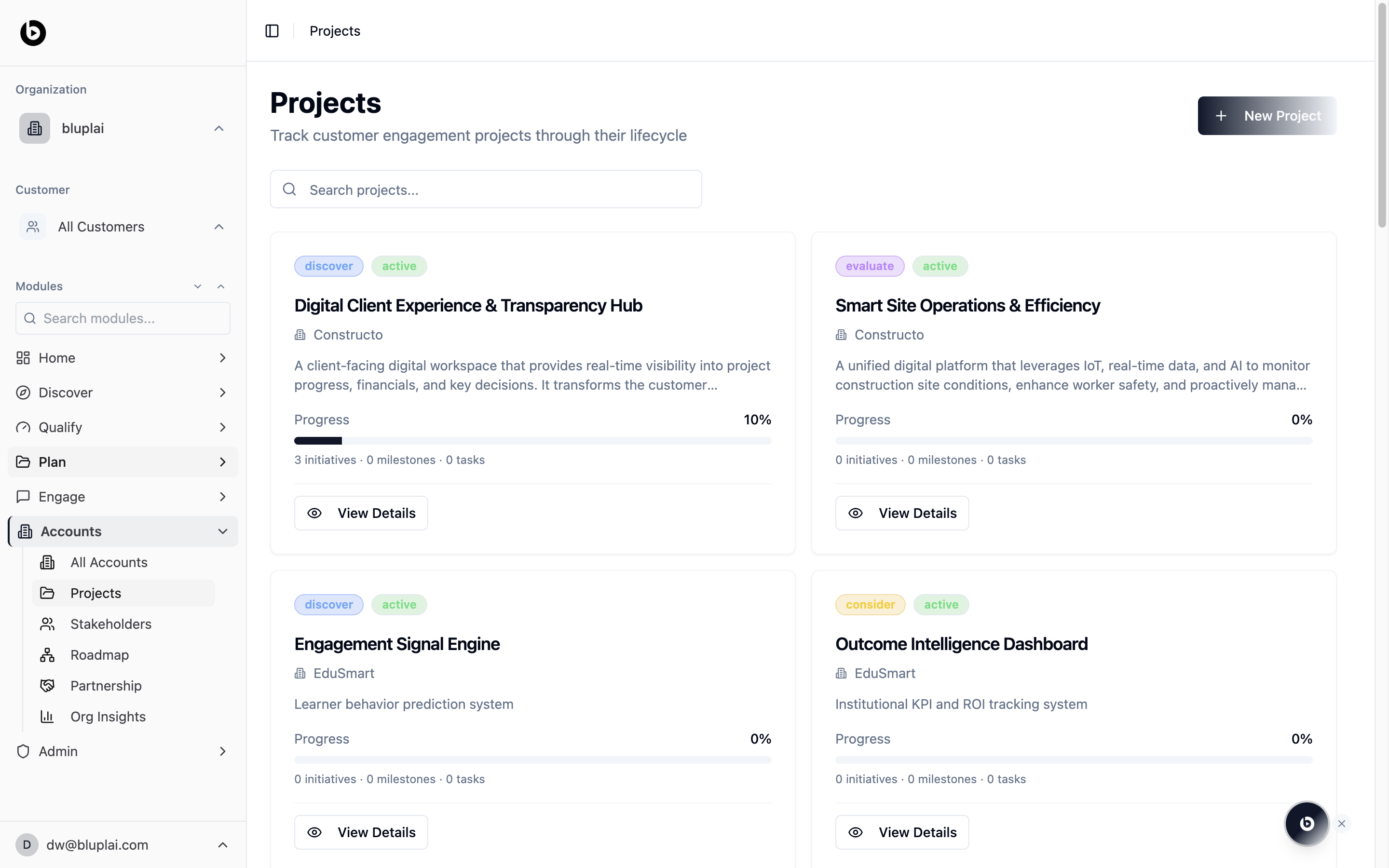 Projects lists every customer engagement across your portfolio in a single grid. Each card names the project, links it to the parent customer, gives a short description, and surfaces how far along it is. Use this page as the operating view for in-flight implementations and transformation programs.When to use it