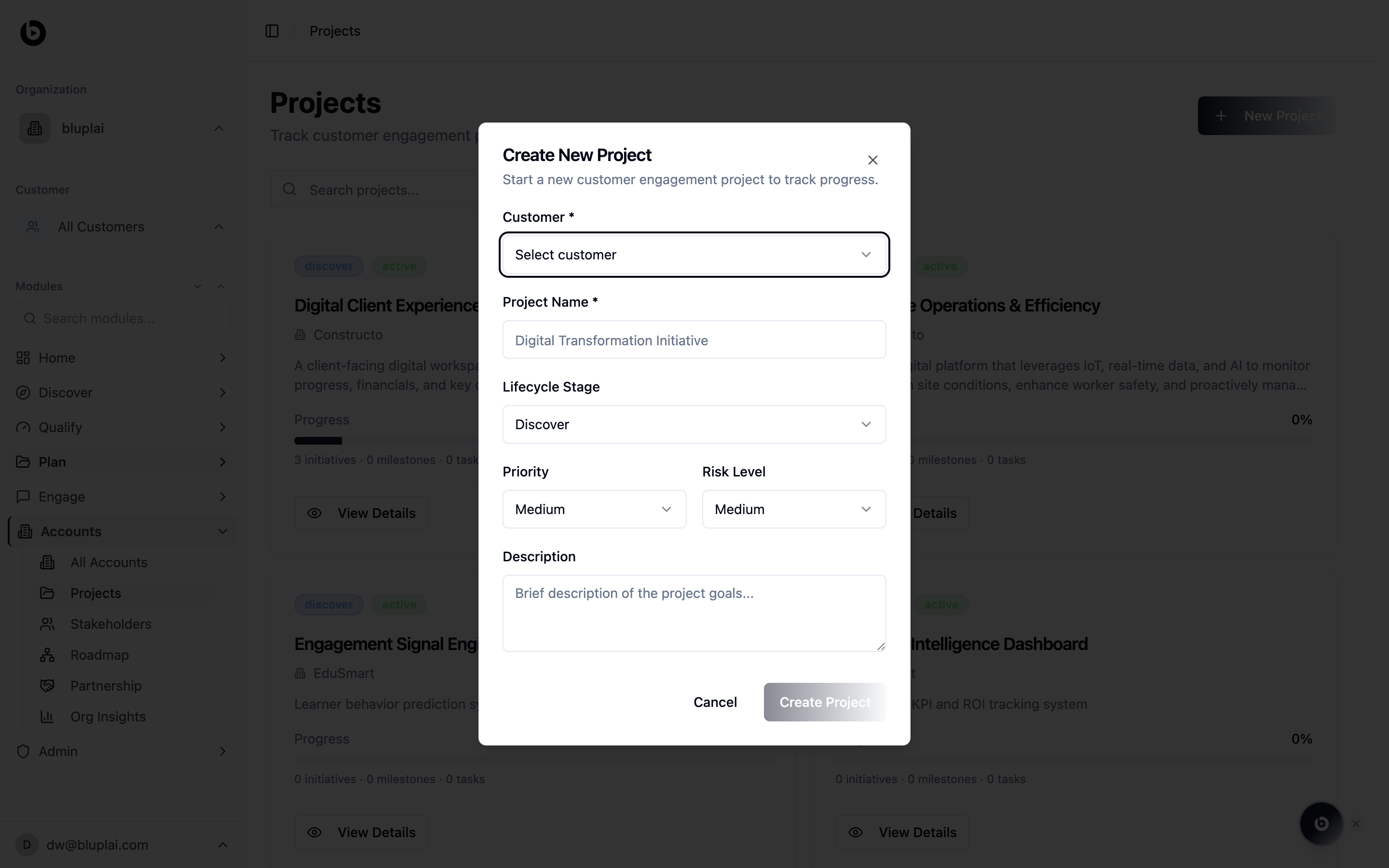 A project is a specific engagement running inside a customer — a delivery, a transformation program, an implementation. Each project gets its own Customer Success Plan, Digital Assessment, and lifecycle stage, so creating one sets up the workspace where initiatives, milestones, and tasks are tracked.How to create one