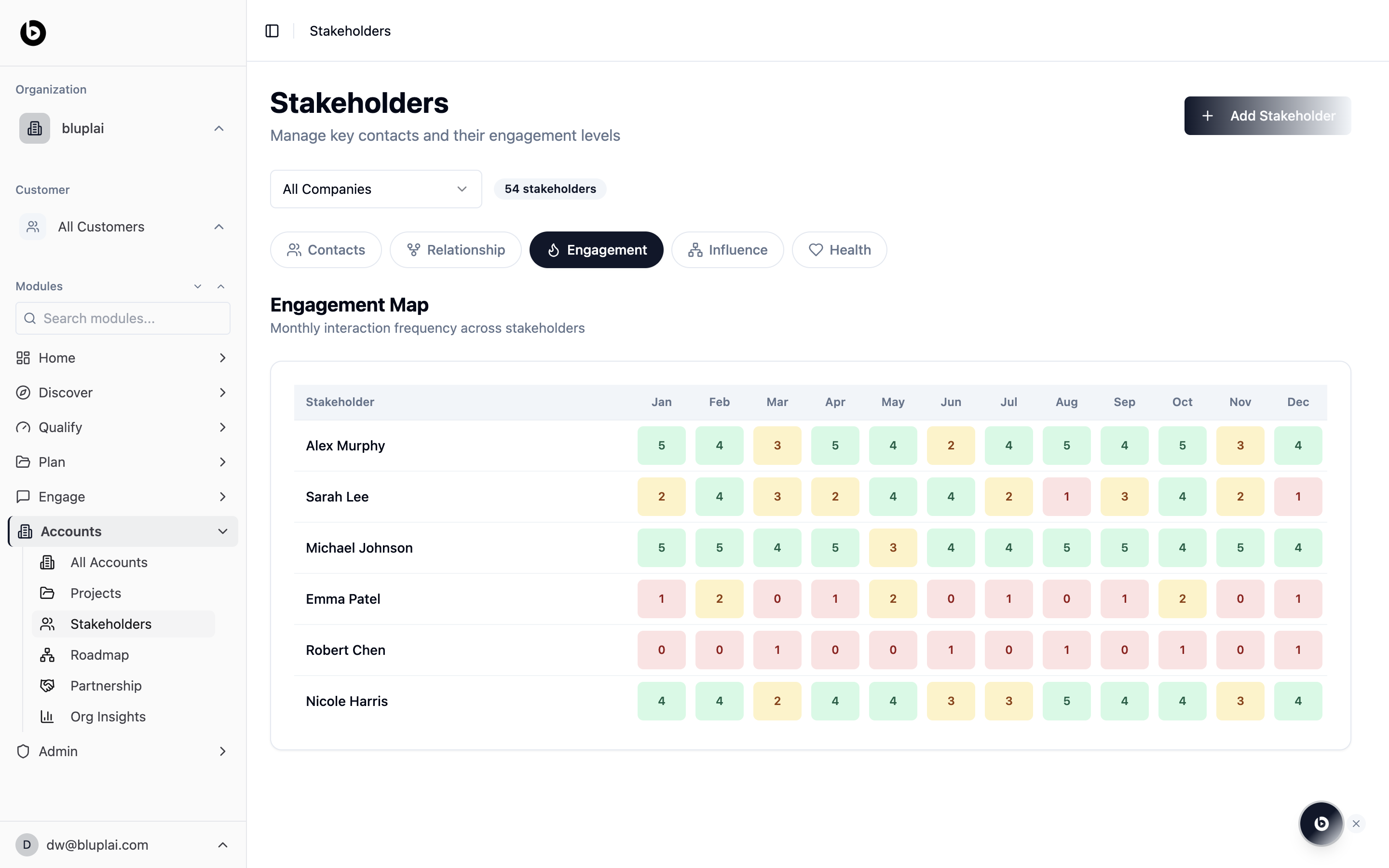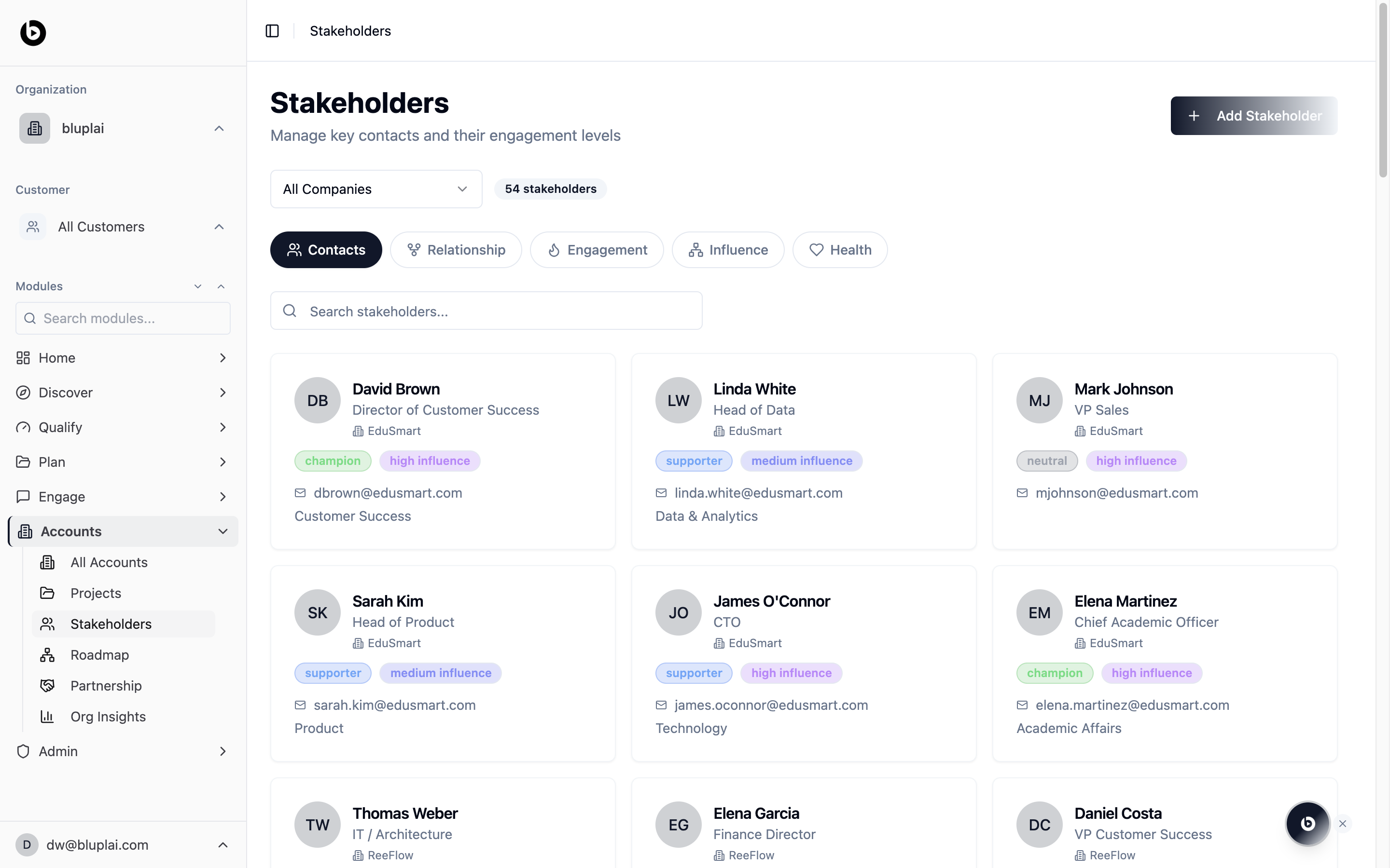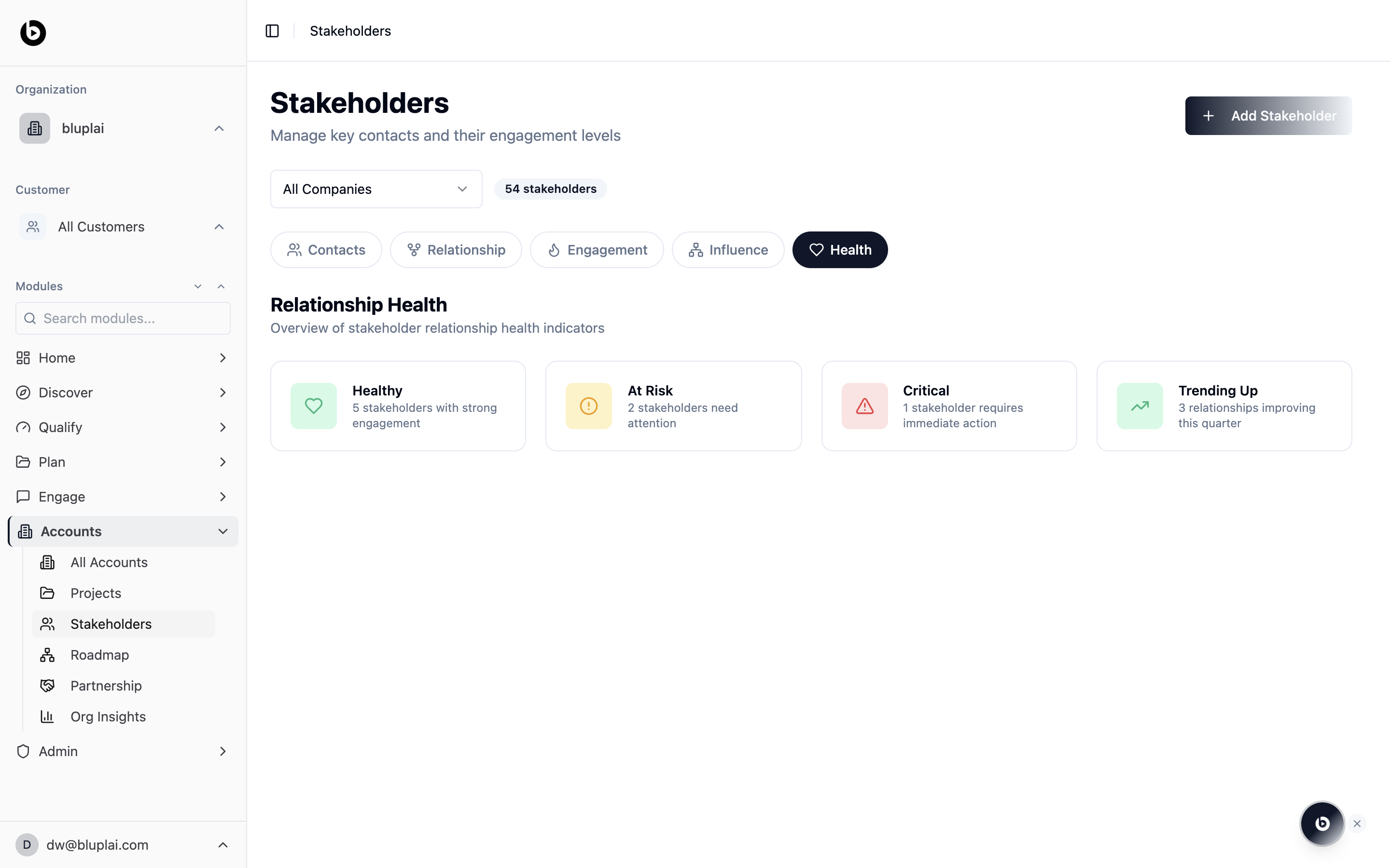 - A header titled Stakeholders with the subtitle “Manage key contacts and their engagement levels” and an Add Stakeholder button.