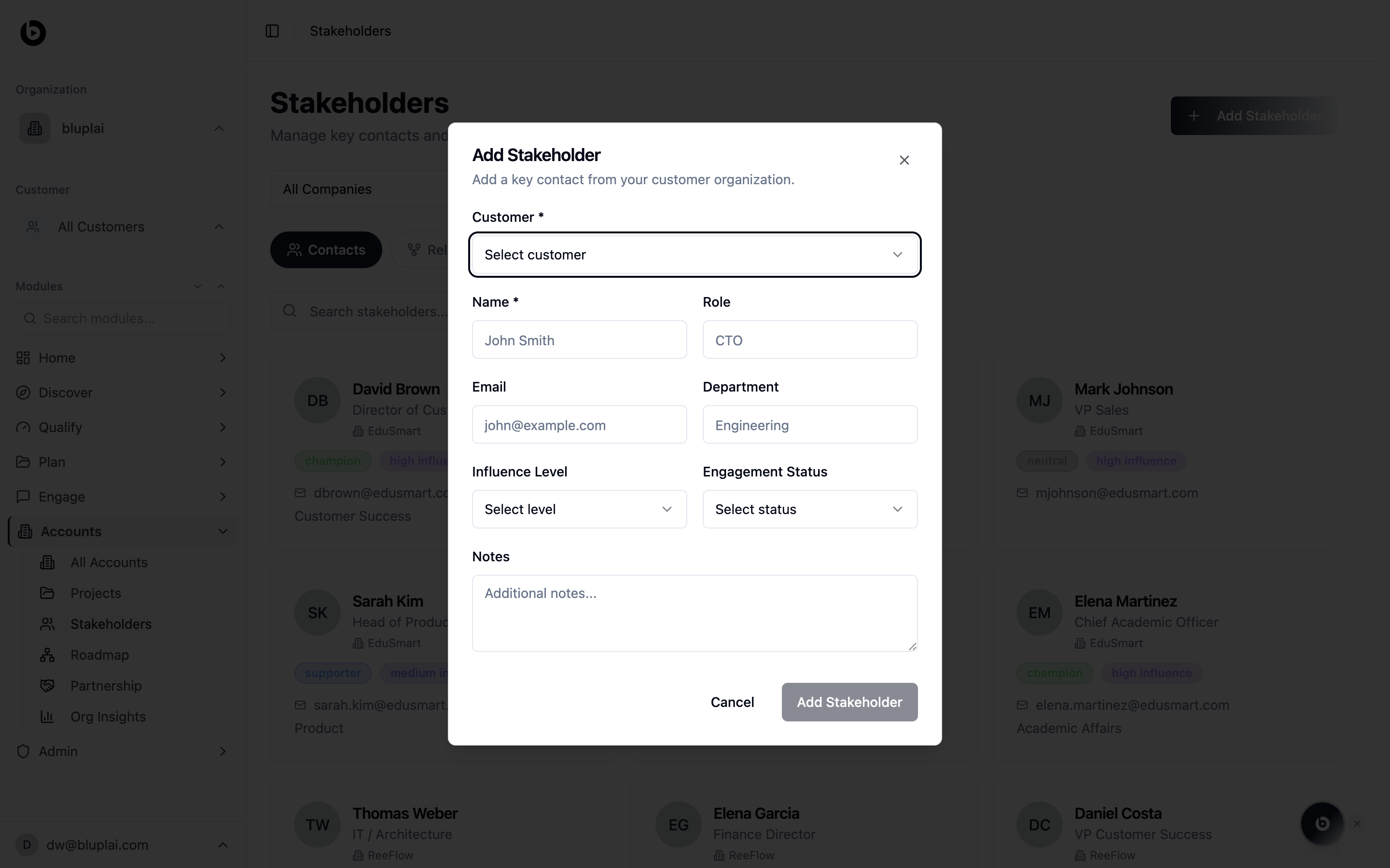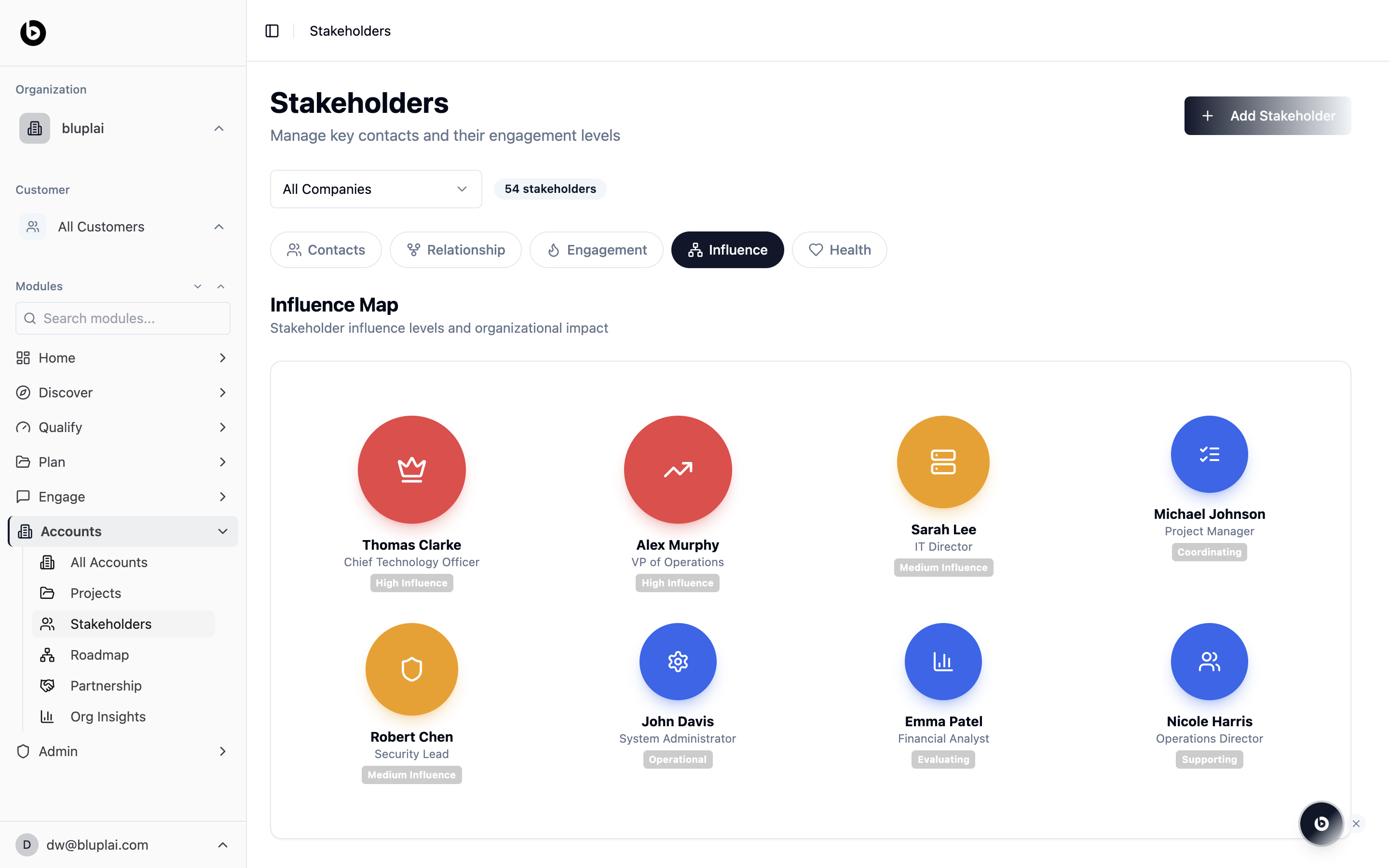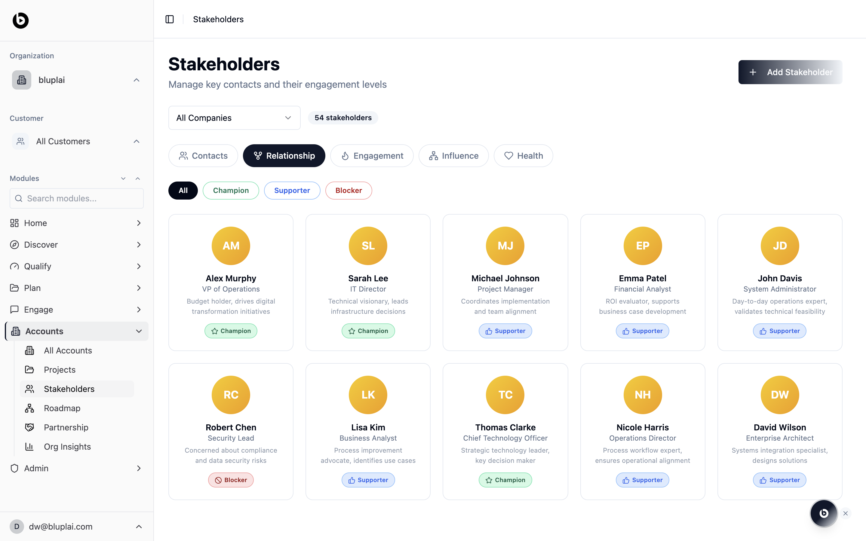 - A header titled Stakeholders with the subtitle “Manage key contacts and their engagement levels” and an Add Stakeholder button.