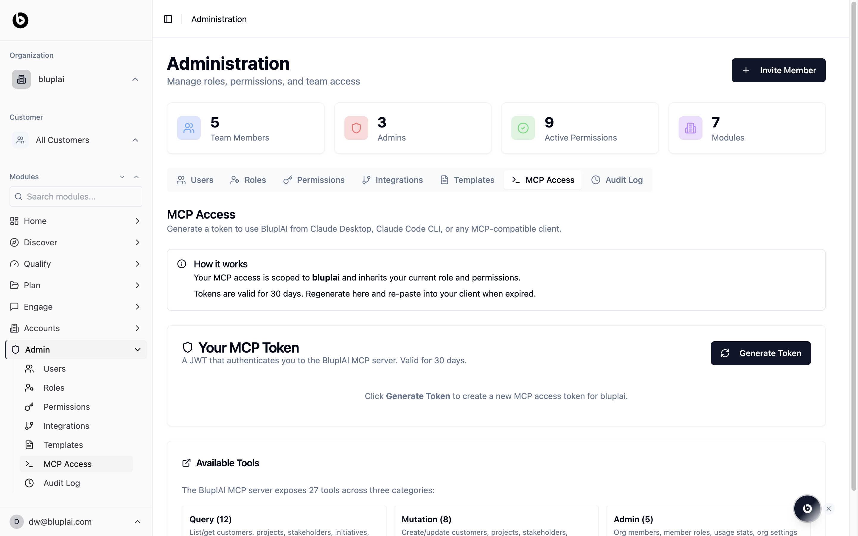 How it works explains the model in two lines: your MCP access is scoped to your organisation and inherits your current role and permissions. Tokens are valid for 30 days; regenerate and re-paste into your client when yours expires. Your MCP Token is where you hit Generate Token to mint a fresh JWT. Until you generate one, the panel sits empty with a prompt to create your first token. Available Tools lists the 27 tools the Bluplai MCP server exposes, grouped in three categories:- Query — list and get customers, projects, stakeholders, initiatives, and more