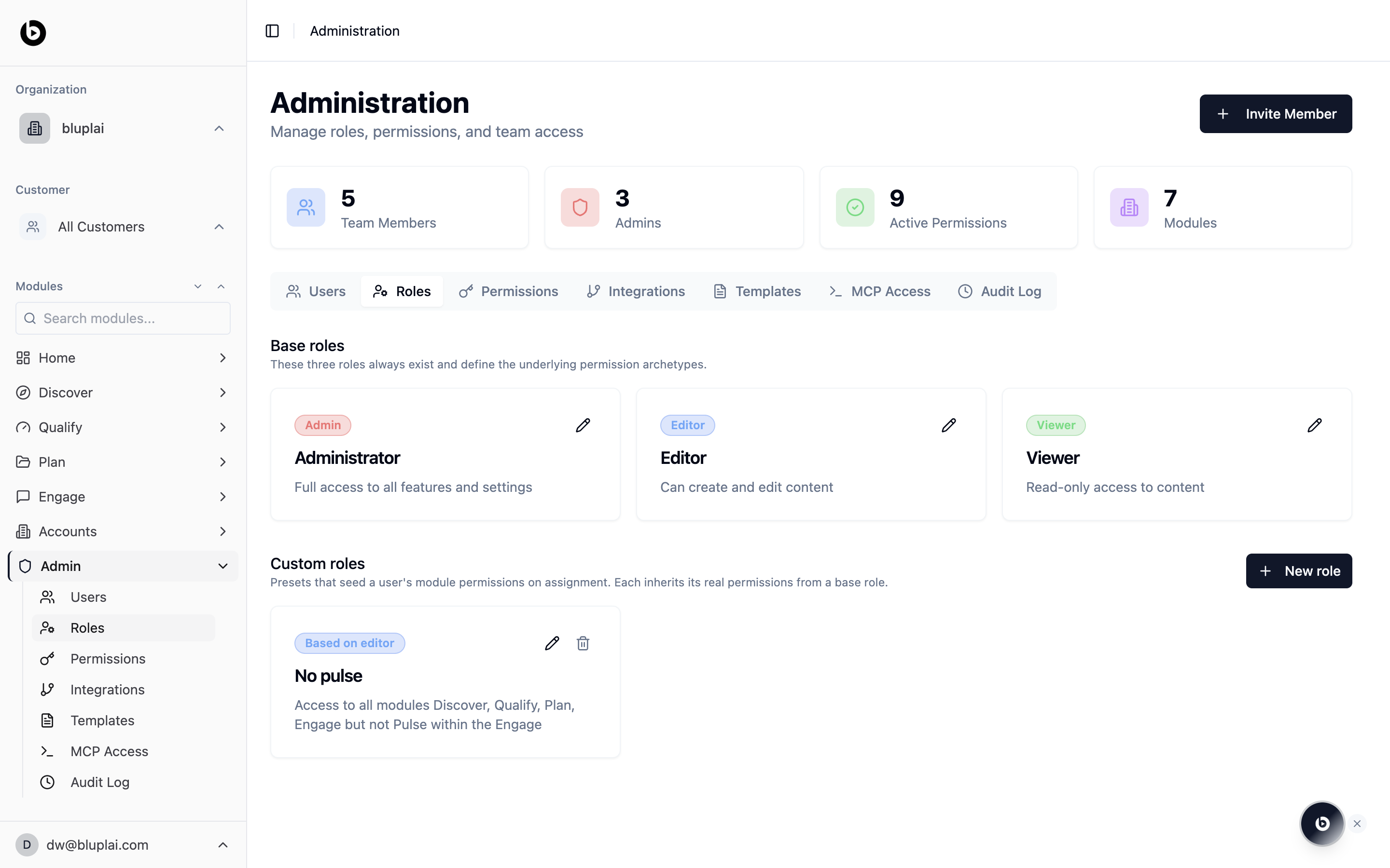 Roles are how you keep the workspace shaped to the way your teams actually work. The three base roles cover most cases, and custom roles let you carve out access patterns for teams that need something narrower — for example, a CS team that works across every module except one.What you’ll see