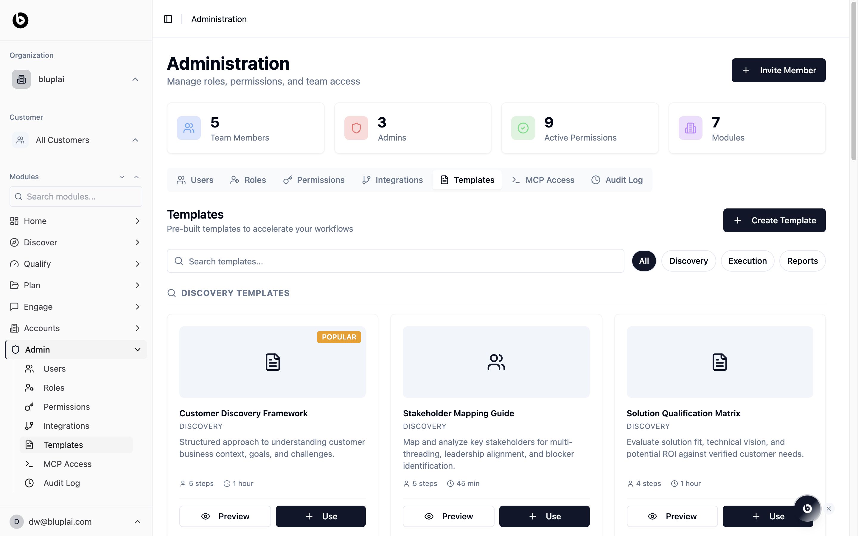Templates today are pre-built and seeded by Bluplai. The Create Template button appears in the UI but isn’t wired up yet — you can Preview and Use existing templates, and authoring your own will arrive in a later release.