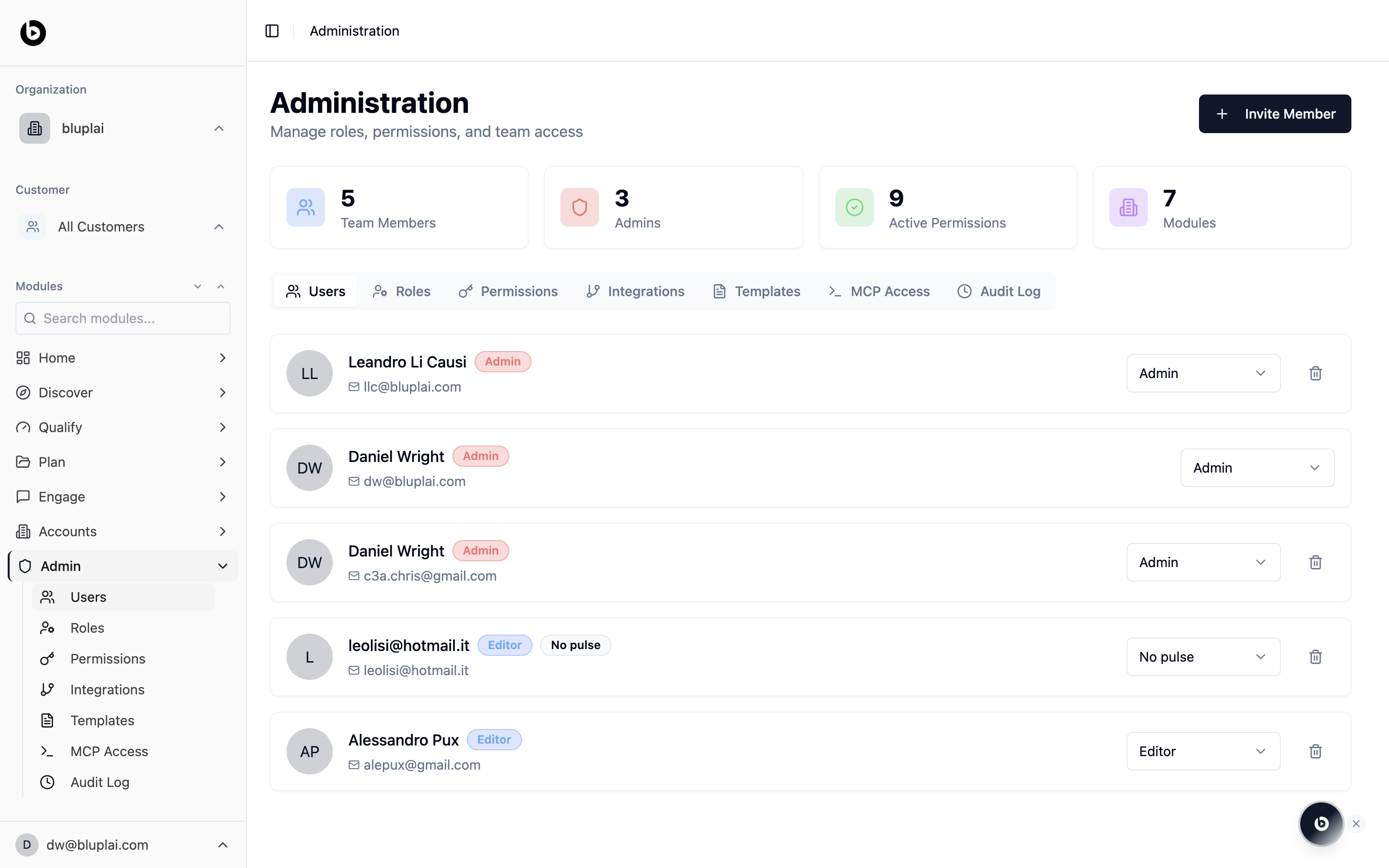 Admin is where you get control and scalability without adding friction, and Users is the starting point. Bluplai is a shared space between your team and your customer, so who has a seat and what role they carry is the first thing to get right. You can onboard a partner in minutes with access only to relevant modules, or bring in a customer-side user with a scoped Viewer role for collaboration without overexposure. That reduces onboarding time by 50%+ and minimizes permission errors — governance without slowing execution. Control and simplicity can coexist — and scale together.What you’ll see