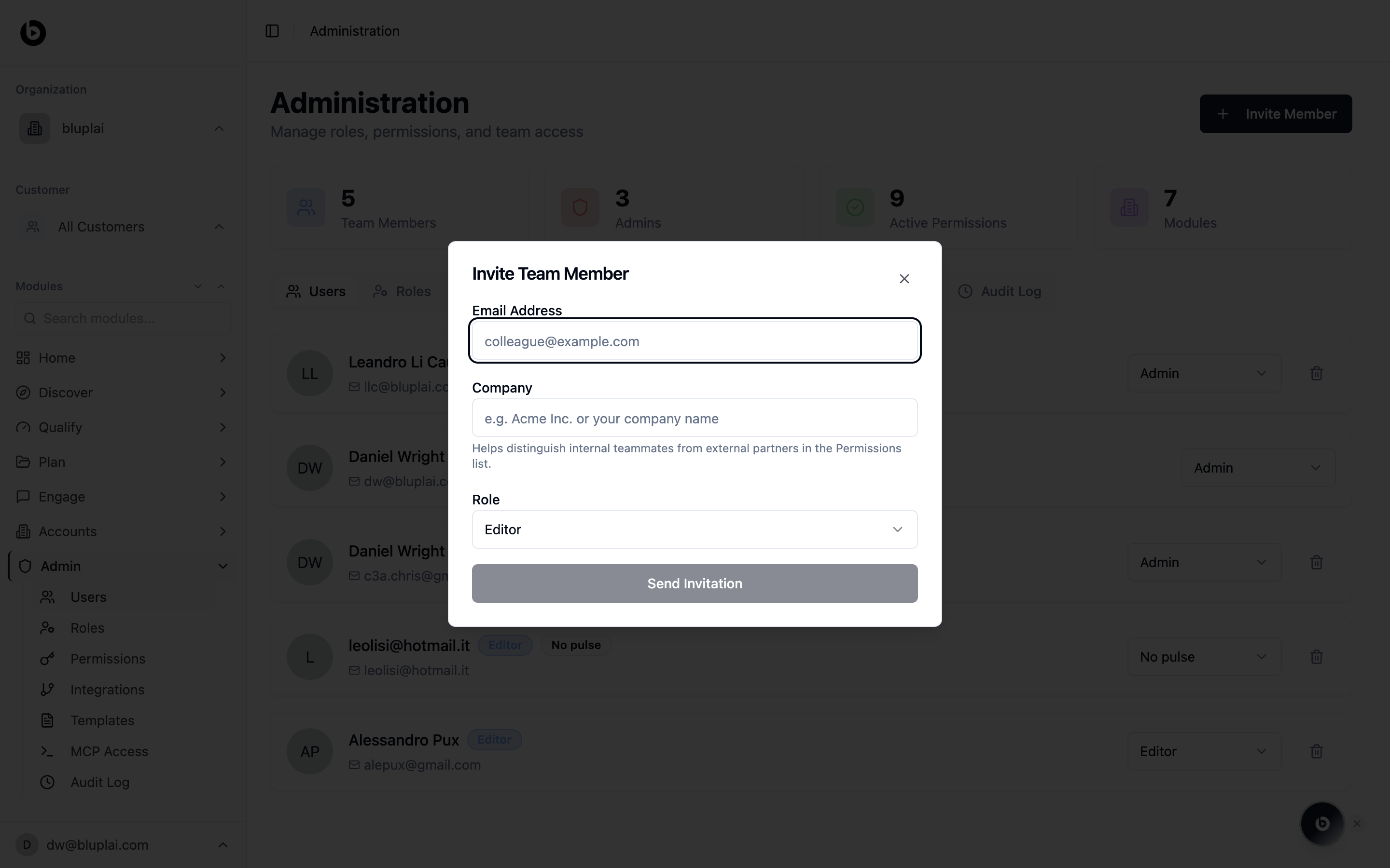 Every person with a seat in Bluplai — internal teammate or customer-side collaborator — comes in through this same dialog. Getting the invite right is how you keep the workspace safe: the right email lands with the right role, and everyone else stays out. It’s also the single place where you signal whether someone is internal or external, which shapes how they appear in Permissions.How to invite one