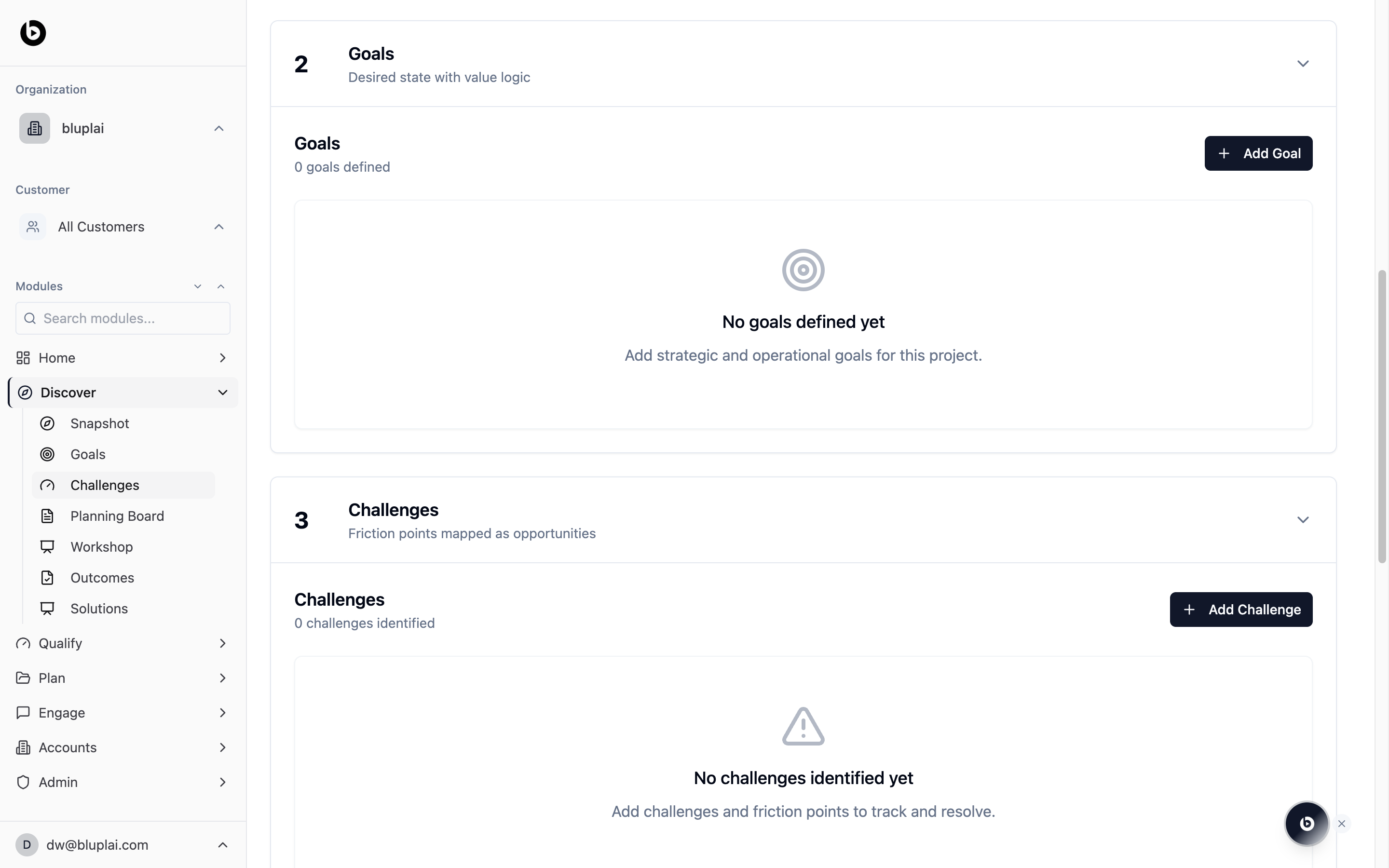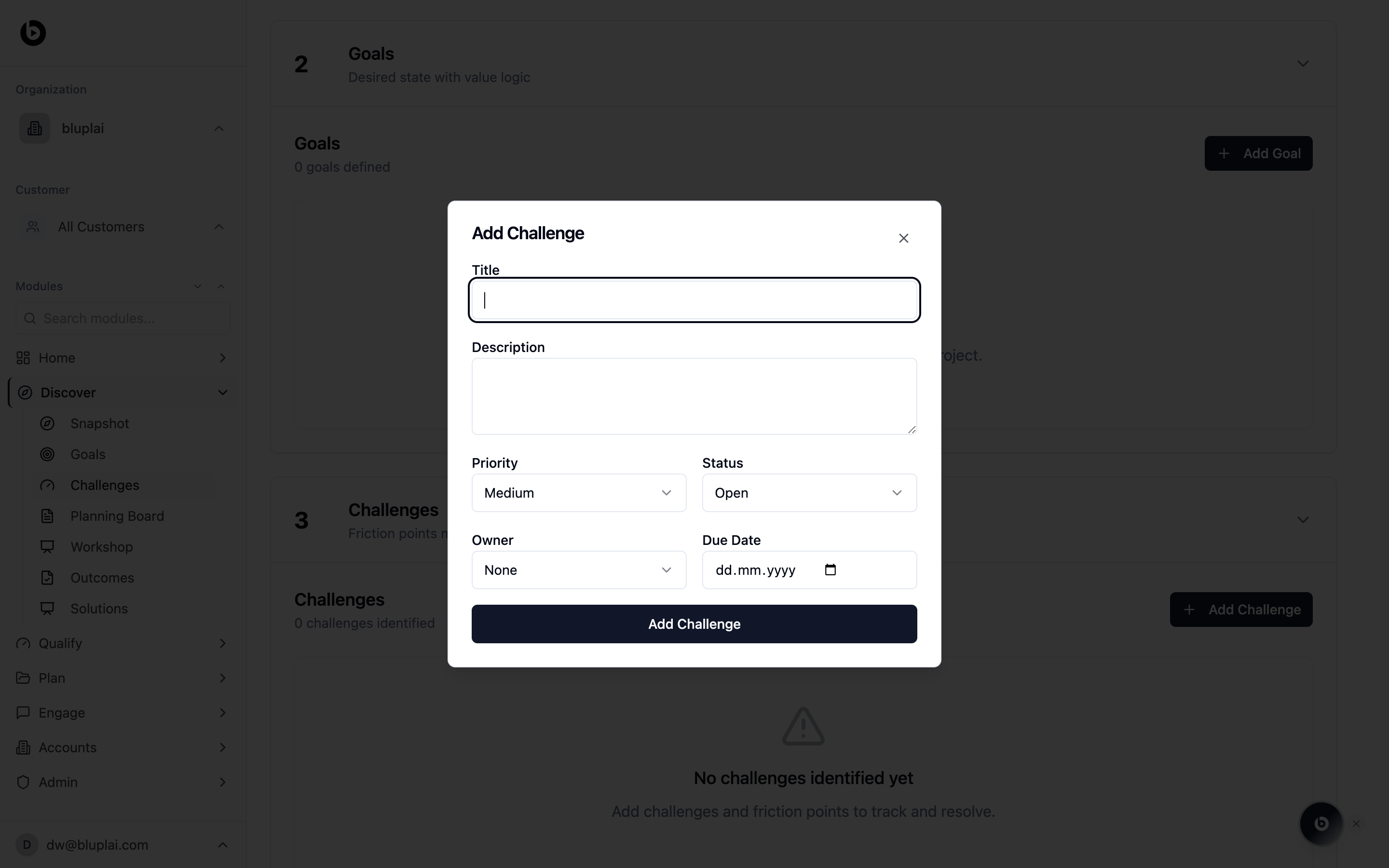 The Challenges section sits below Goals on the Discover page and captures what’s in the way. Every friction point, pain, blocker, or risk the customer raises lives here — framed as an opportunity rather than a complaint. Logged challenges travel forward into Qualify (where they become validated problems) and Plan (where they map to initiatives and actions).What you’ll see