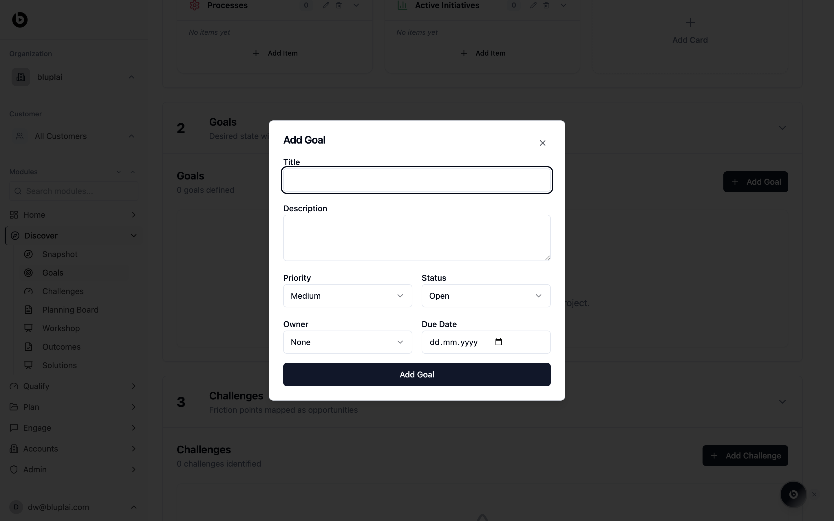 A goal captures what the customer wants to achieve and is the structured entry point for value logic in the Discover flow. Each goal you log here feeds Qualify, where it becomes an Outcome with a value model, and Plan, where it drives the initiatives built to deliver it.How to create one