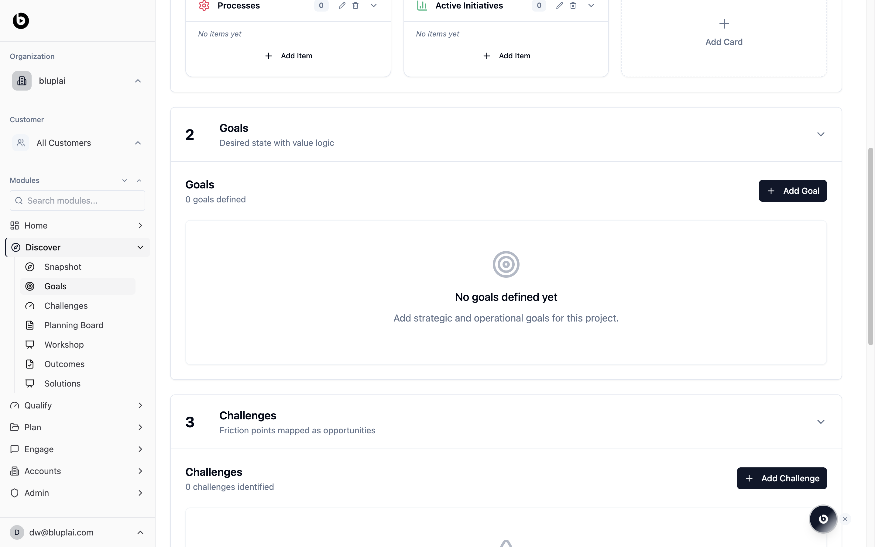 The Goals section sits below Snapshot on the Discover page and captures what the customer actually wants to achieve. It’s the “desired state” counterpart to the current-state Snapshot — OKRs, KPI targets, business outcomes, and the value logic that connects each goal to a measurable result. Goals logged here flow forward into Qualify (to size the opportunity) and Plan (to build the initiatives that deliver them).What you’ll see