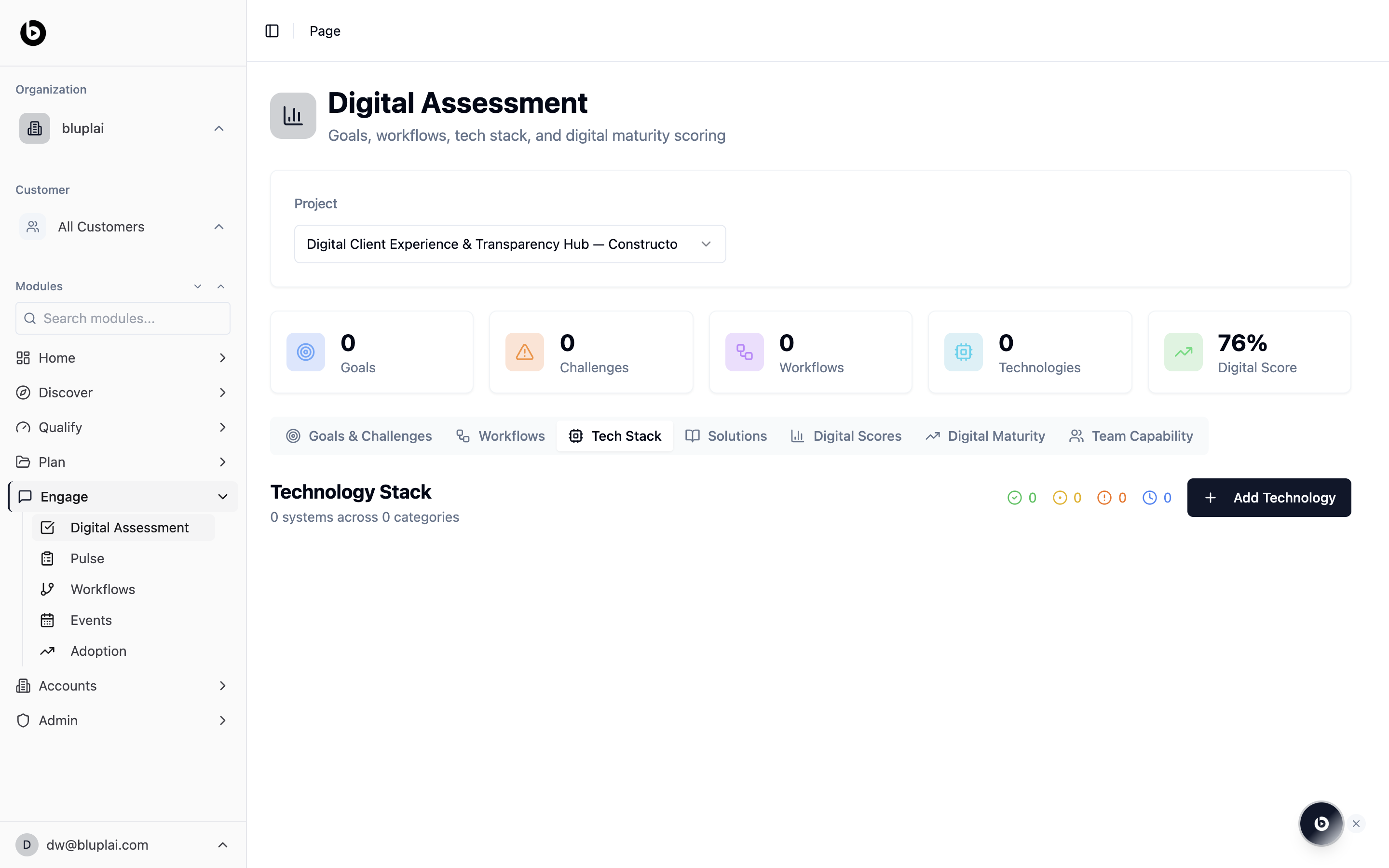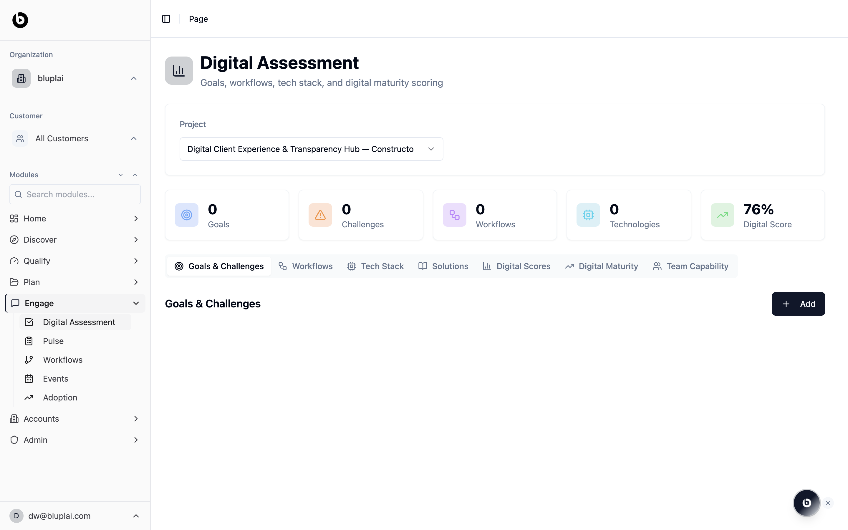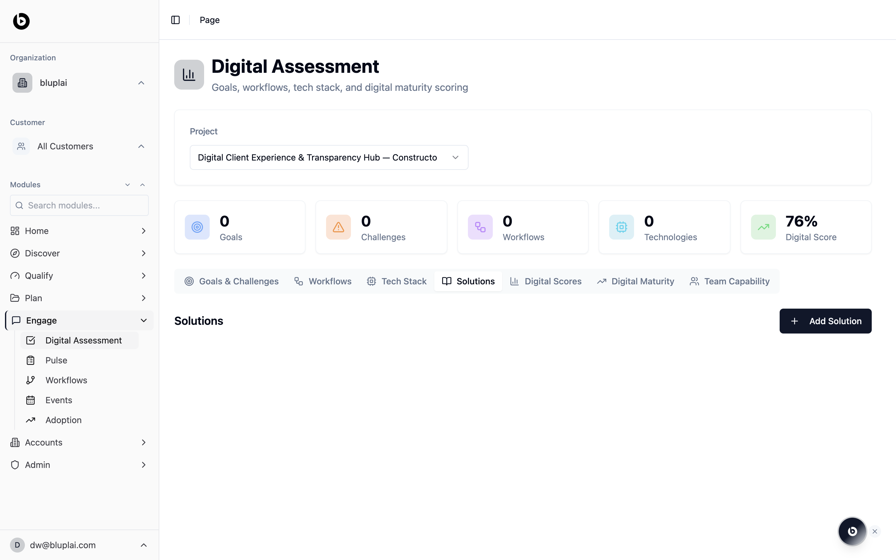 Engage is where the relationship is actively managed with the customer, and Digital Assessment is the diagnostic that anchors it. It’s scoped to a single project and pulls goals, challenges, workflows, tech stack, solutions, scoring, and team capability into one view you build with the customer — and with multiple customer teams directly. When you prep a QBR, you pull initiatives, outcomes, and progress from existing Bluplai data instead of starting from scratch, so QBR prep drops from ~6 hours to 2–3 hours. Partners who join the workspace see the same baseline you do — no re-doing discovery every time a new person lands. You work with the customer — not around them.Digital Assessment fills in from within each tab — open Goals & Challenges, Workflows, Tech Stack, Solutions, or the scoring tabs to add items. The assessment score updates as you fill it in.