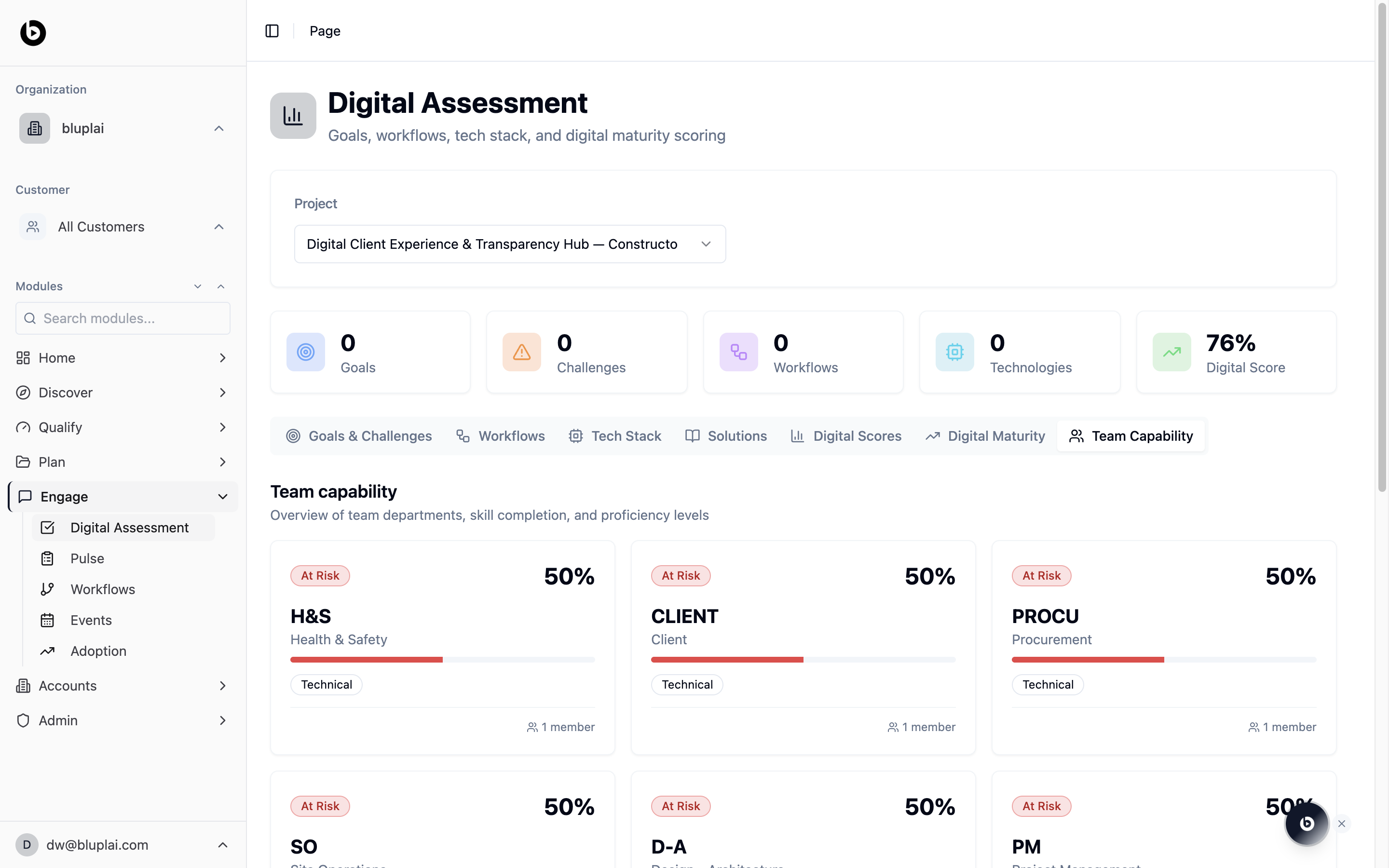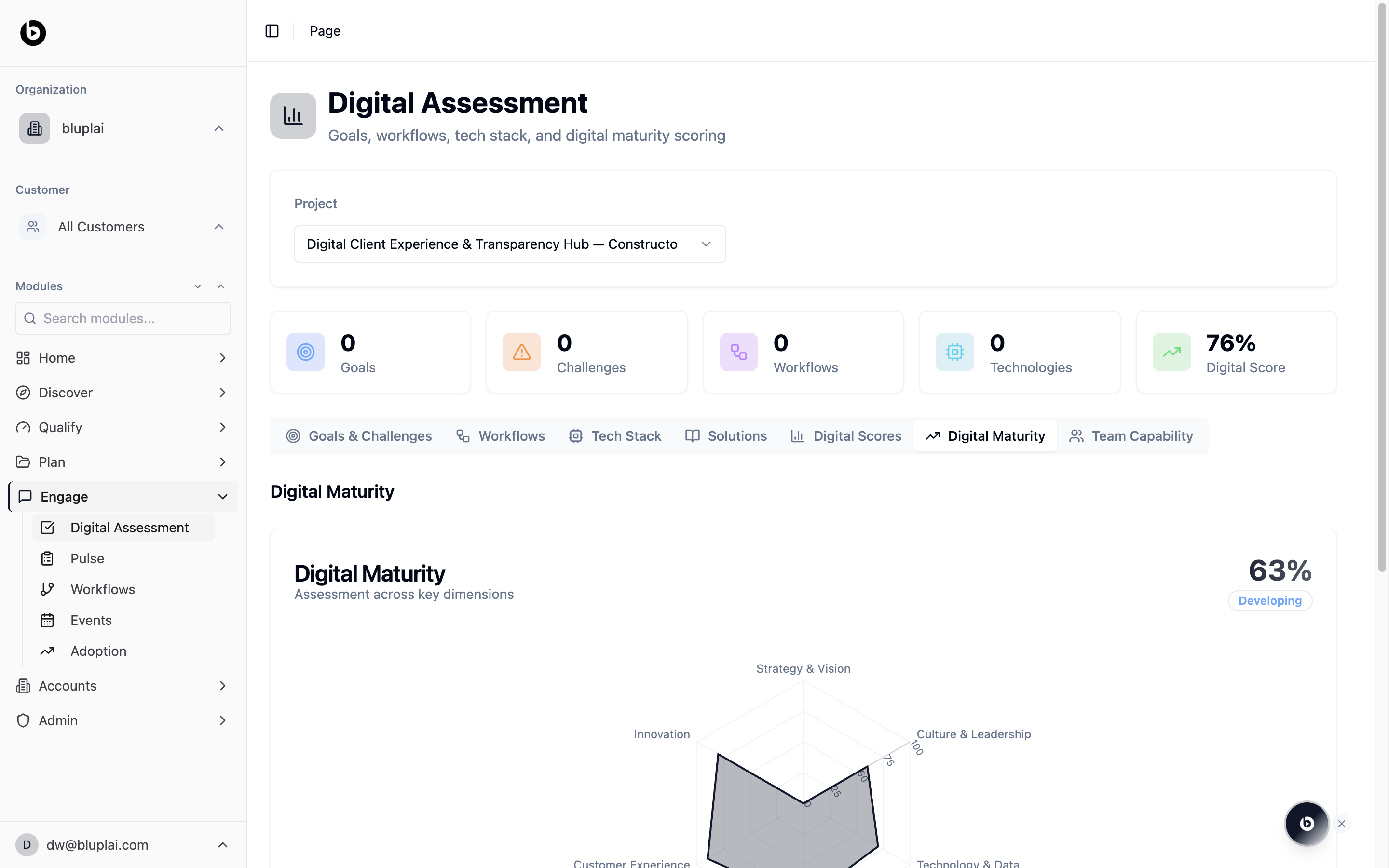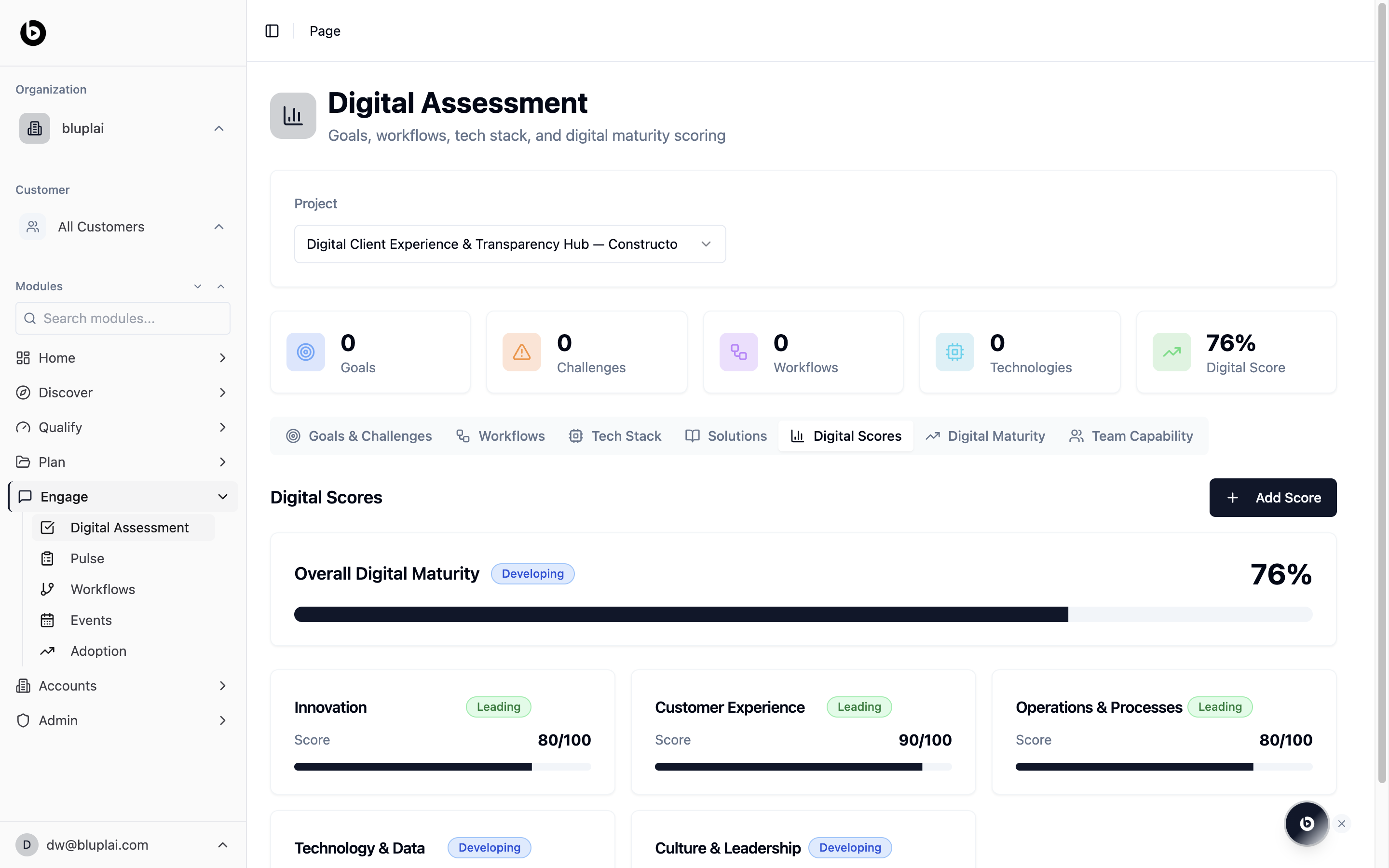 Engage is where the relationship is actively managed with the customer, and Digital Assessment is the diagnostic that anchors it. It’s scoped to a single project and pulls goals, challenges, workflows, tech stack, solutions, scoring, and team capability into one view you build with the customer — and with multiple customer teams directly. When you prep a QBR, you pull initiatives, outcomes, and progress from existing Bluplai data instead of starting from scratch, so QBR prep drops from ~6 hours to 2–3 hours. Partners who join the workspace see the same baseline you do — no re-doing discovery every time a new person lands. You work with the customer — not around them.Digital Assessment fills in from within each tab — open Goals & Challenges, Workflows, Tech Stack, Solutions, or the scoring tabs to add items. The assessment score updates as you fill it in.