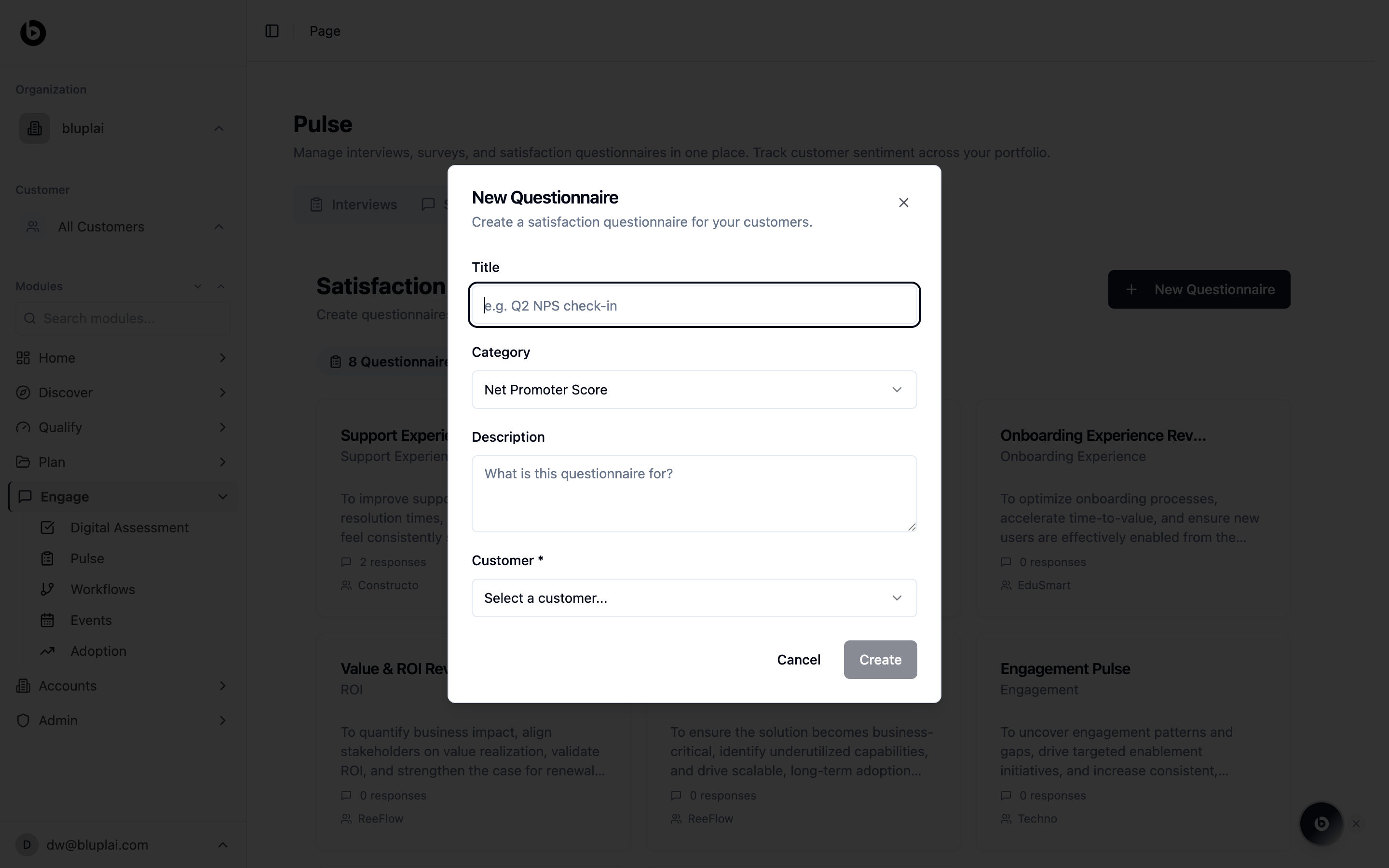 A satisfaction questionnaire is how you capture CSAT or NPS after a milestone and trend sentiment over time. Creating one scoped to a specific customer means each response rolls into the right history, so you can compare quarter over quarter instead of guessing at the mood. It’s the signal that anchors renewal and QBR conversations.How to create one