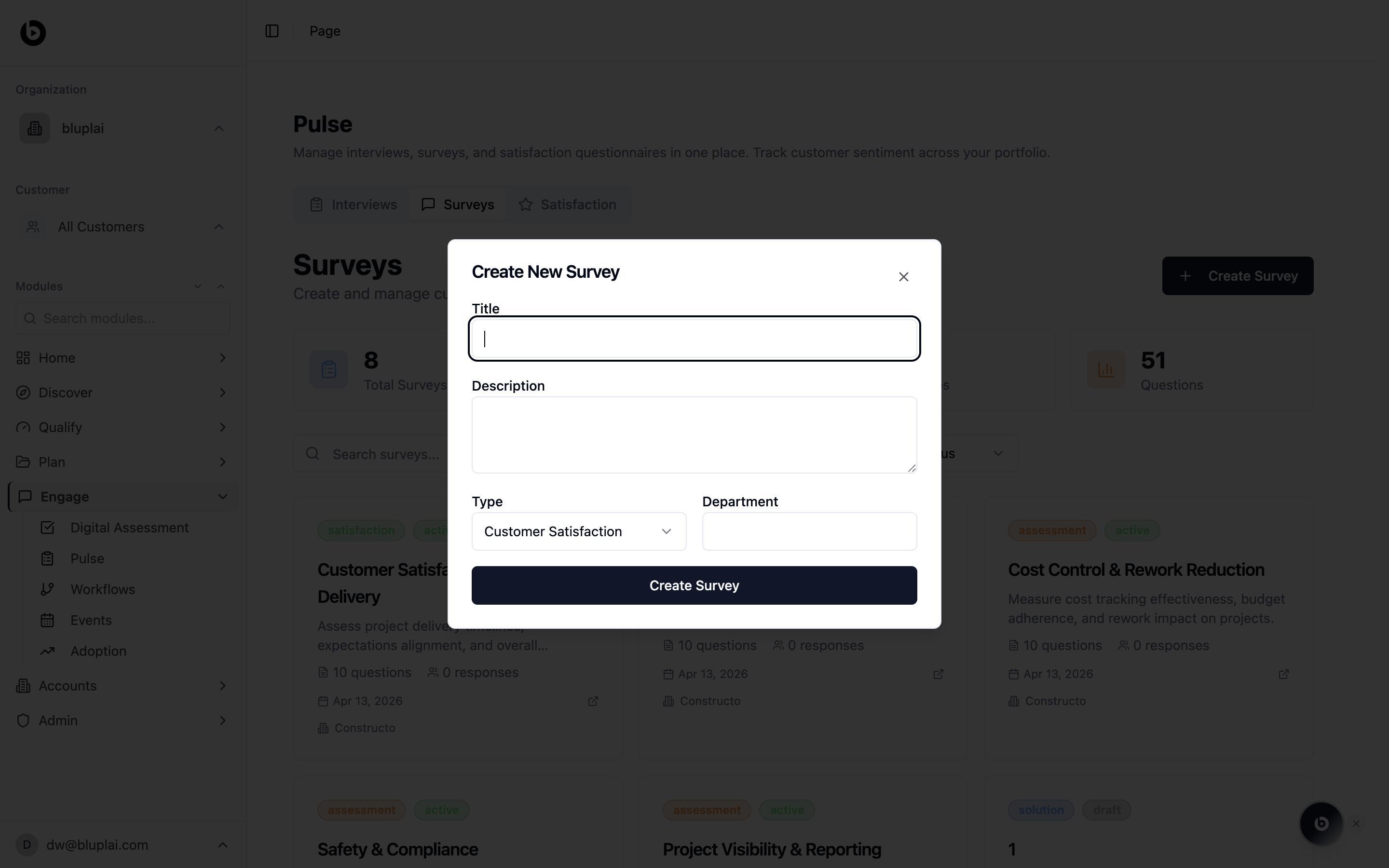 /engage/pulse on the Surveys tab, click Create Survey in the top right. The dialog titled “Create New Survey” opens.Fill in the details