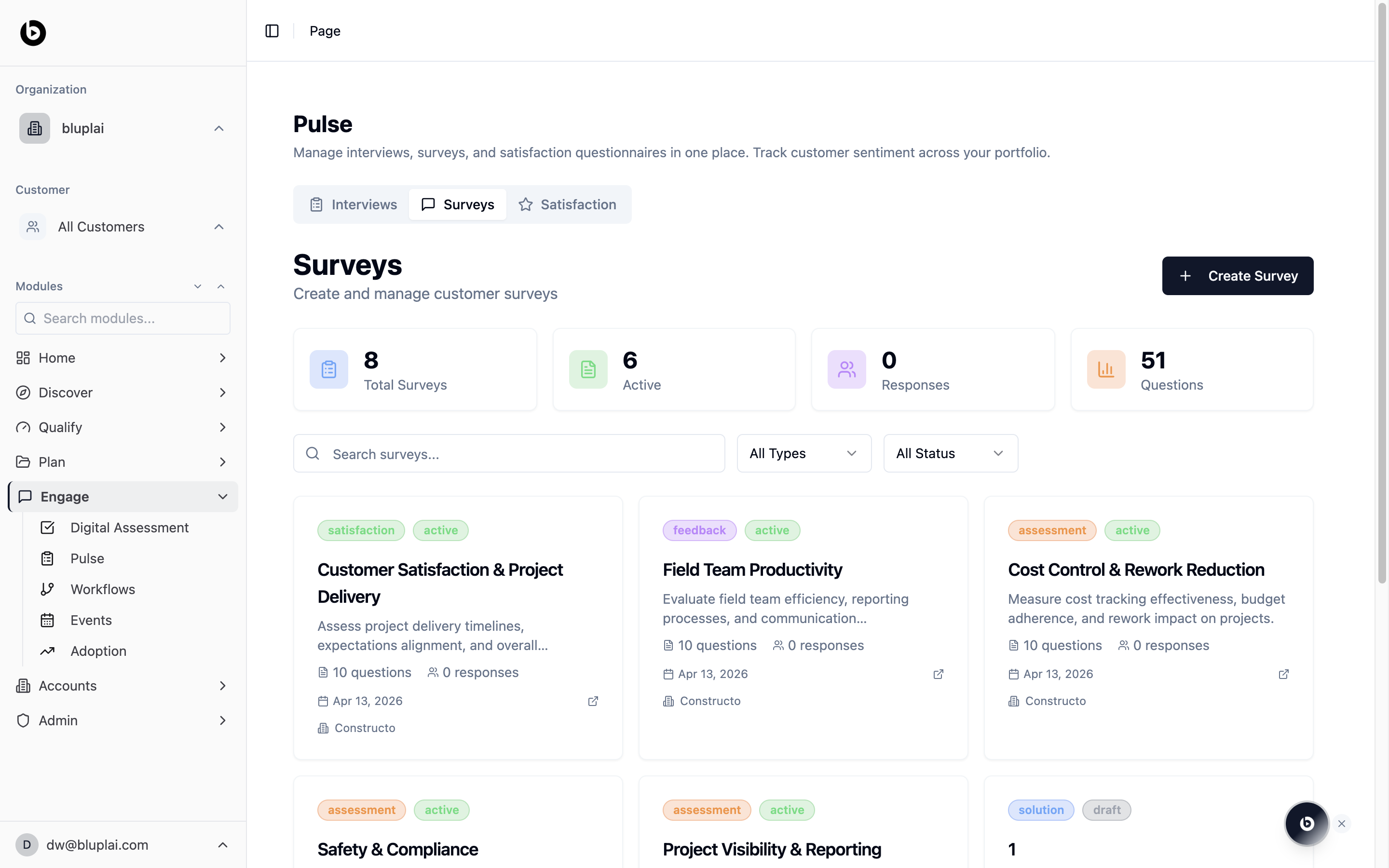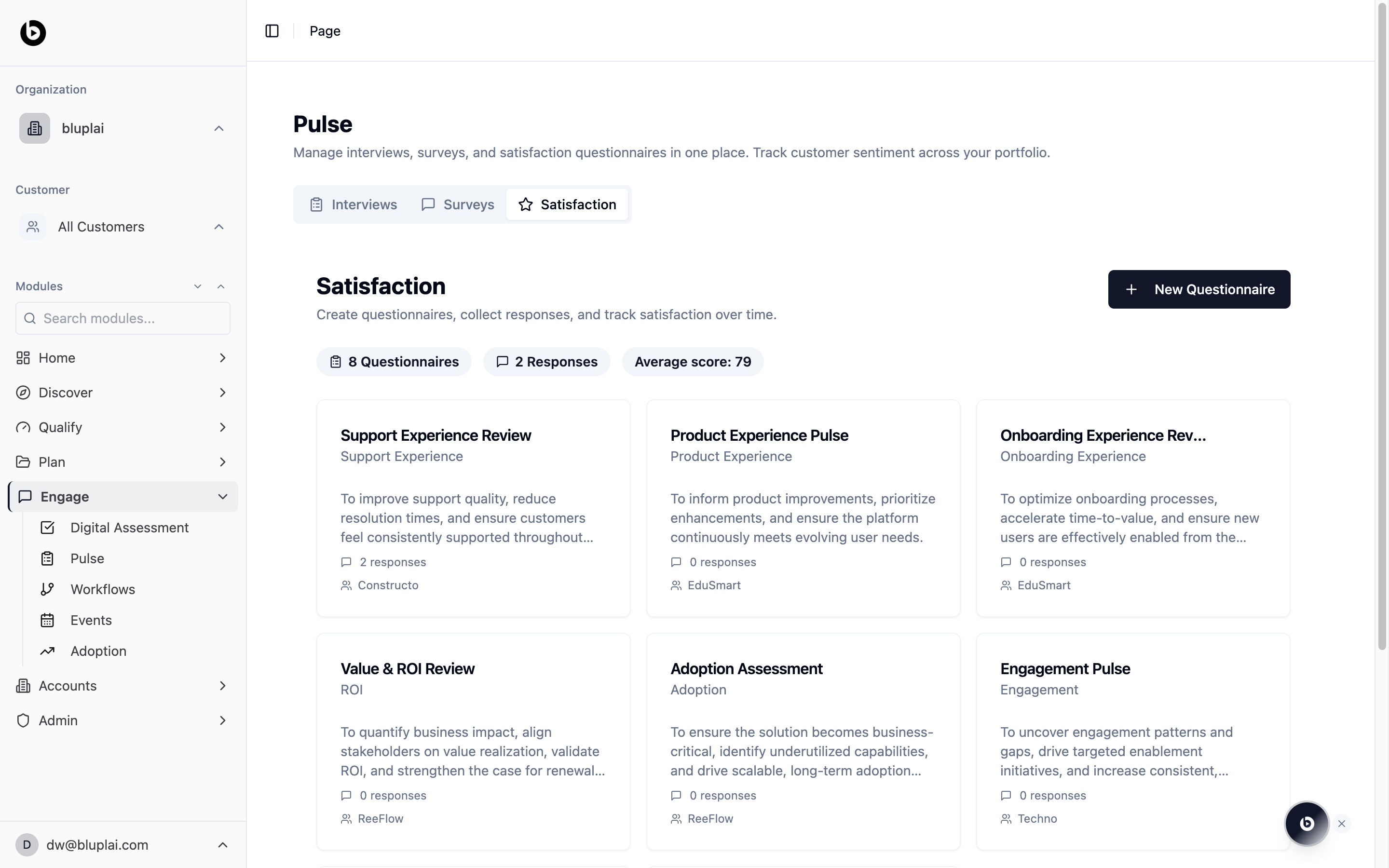 Pulse is where the customer’s voice lives inside the workspace. Interviews, surveys, and satisfaction scores all sit on the same page — visible to your team, your partners, and the customer themselves. Instead of chasing responses over email or piecing sentiment together from scattered decks, you capture it once and everyone sees it. When you prep for a QBR, the evidence is already here.