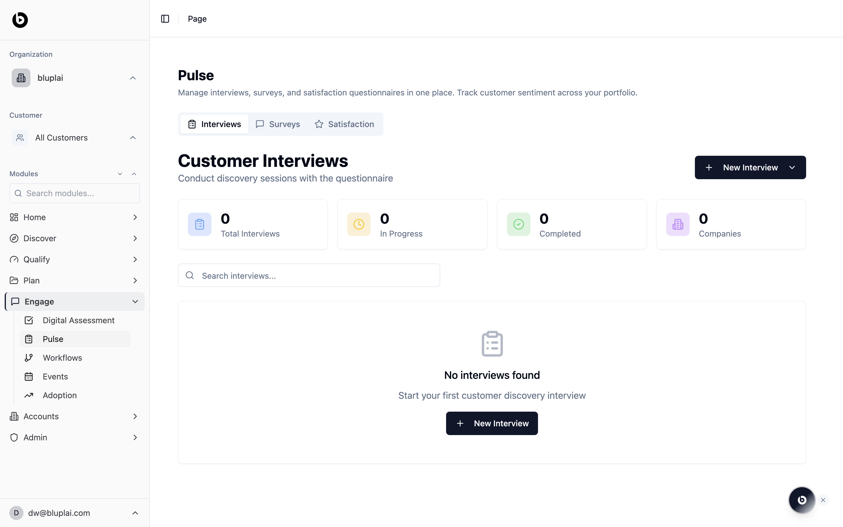 Three tabs sit under the page title: Interviews, Surveys, and Satisfaction. The header reads “Manage interviews, surveys, and satisfaction questionnaires in one place. Track customer sentiment across your portfolio.” Each tab has its own counters, its own create action, and its own list underneath.Tabs