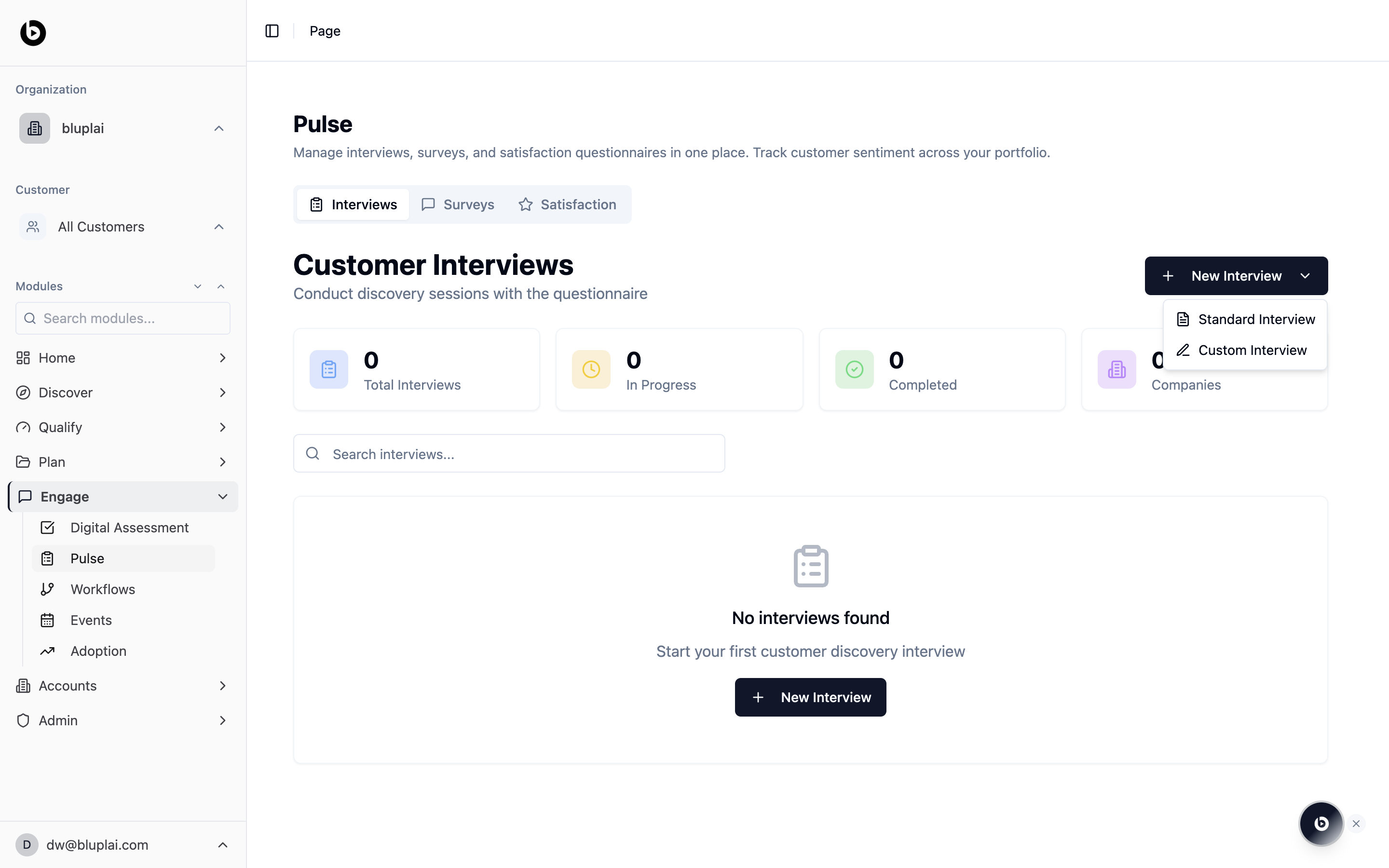 /engage/pulse on the Interviews tab, click New Interview in the top right. A menu opens with two choices — Standard Interview or Custom Interview.Pick the format