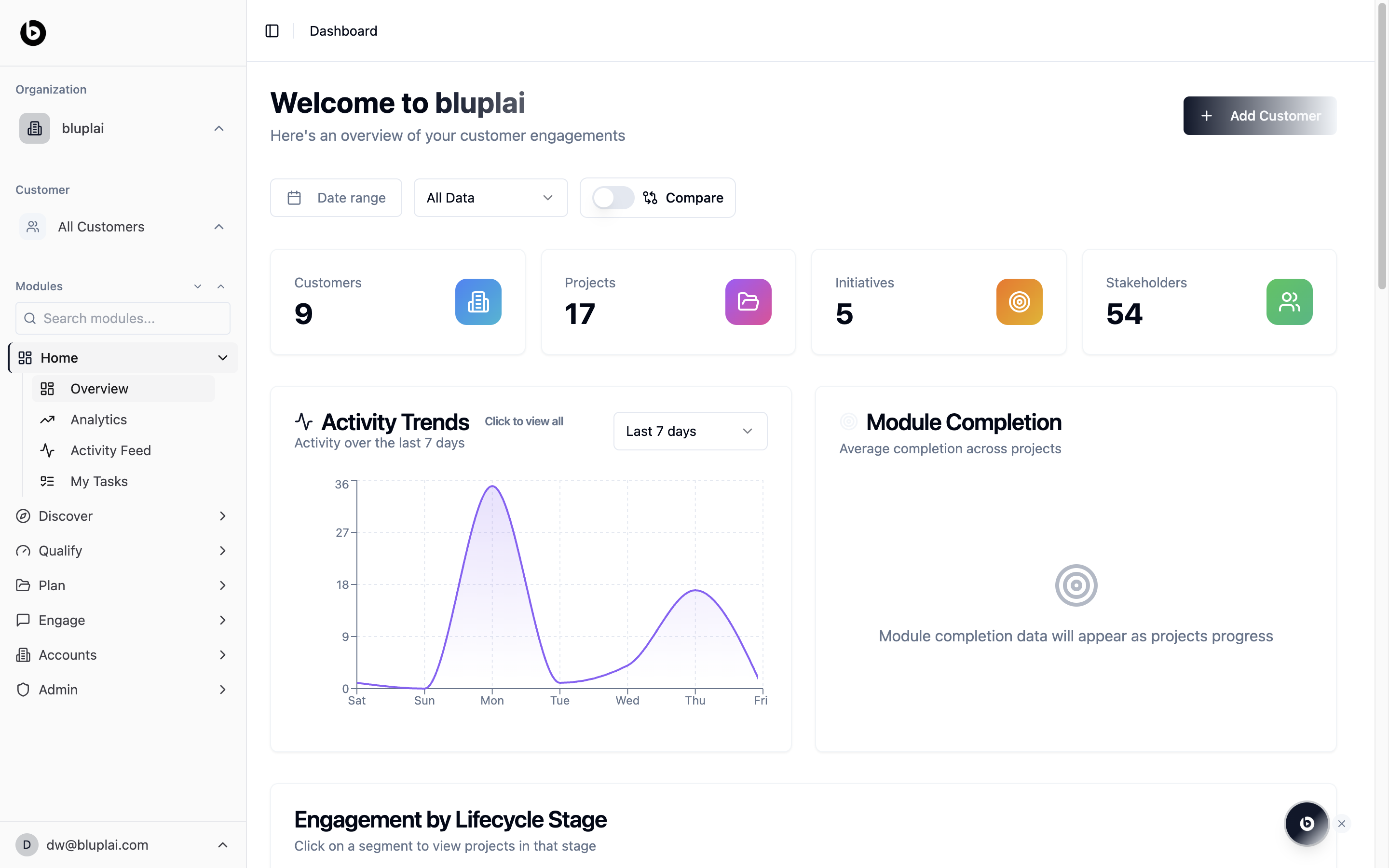 - An Engagement by Lifecycle Stage section lower down, where each segment maps to Discover, Qualify, Plan, Engage, or Deliver — click a segment to drill into the projects sitting in that stage.