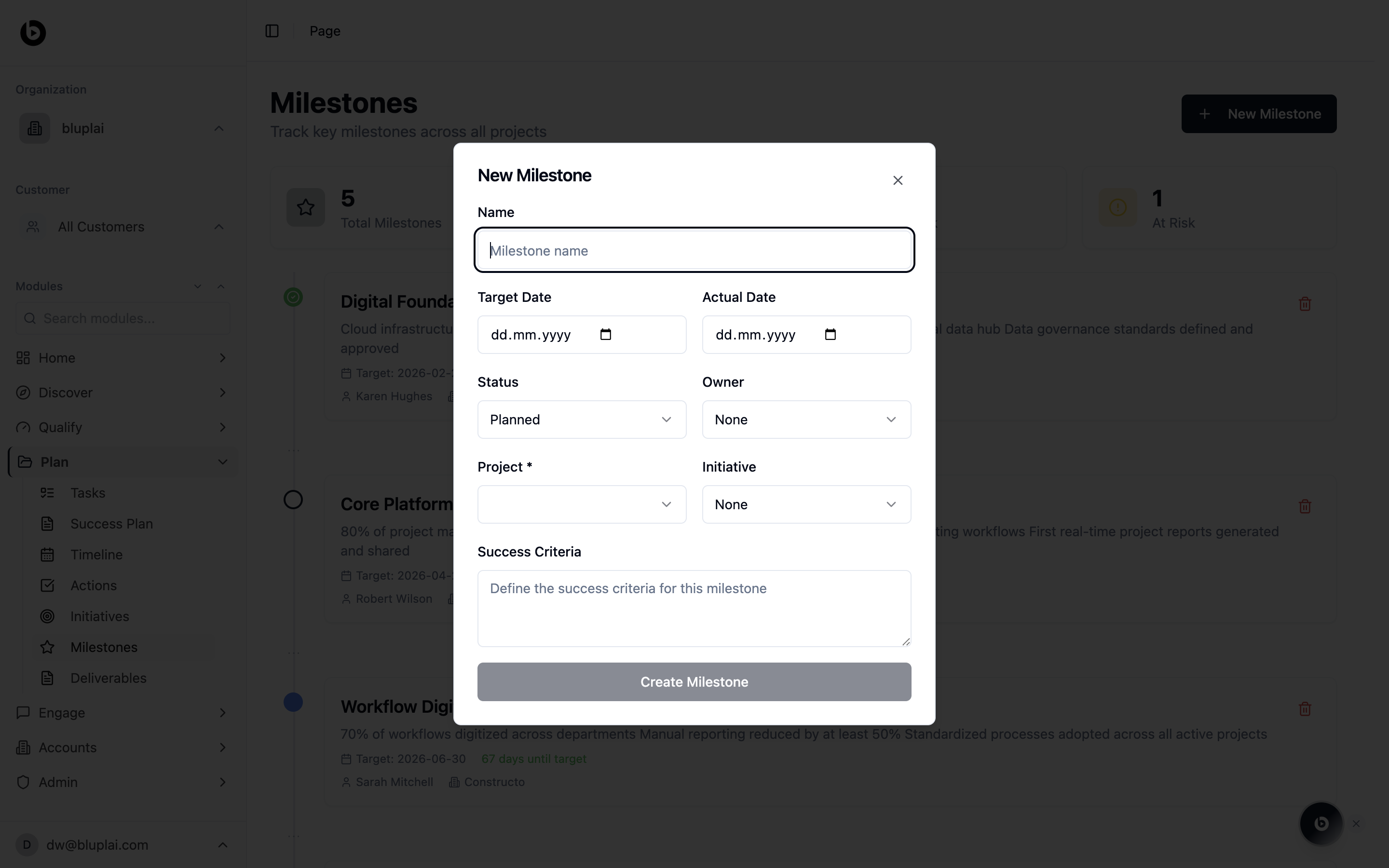Milestones are the customer-visible checkpoints — “X was delivered”, “Y went live” — that a sponsor actually asks about. Creating one in Plan pins that commitment to a project and initiative so the work feeding it, and the date it’s due, have one place of truth. It’s what surfaces in steering committees and renewal conversations.How to create one
