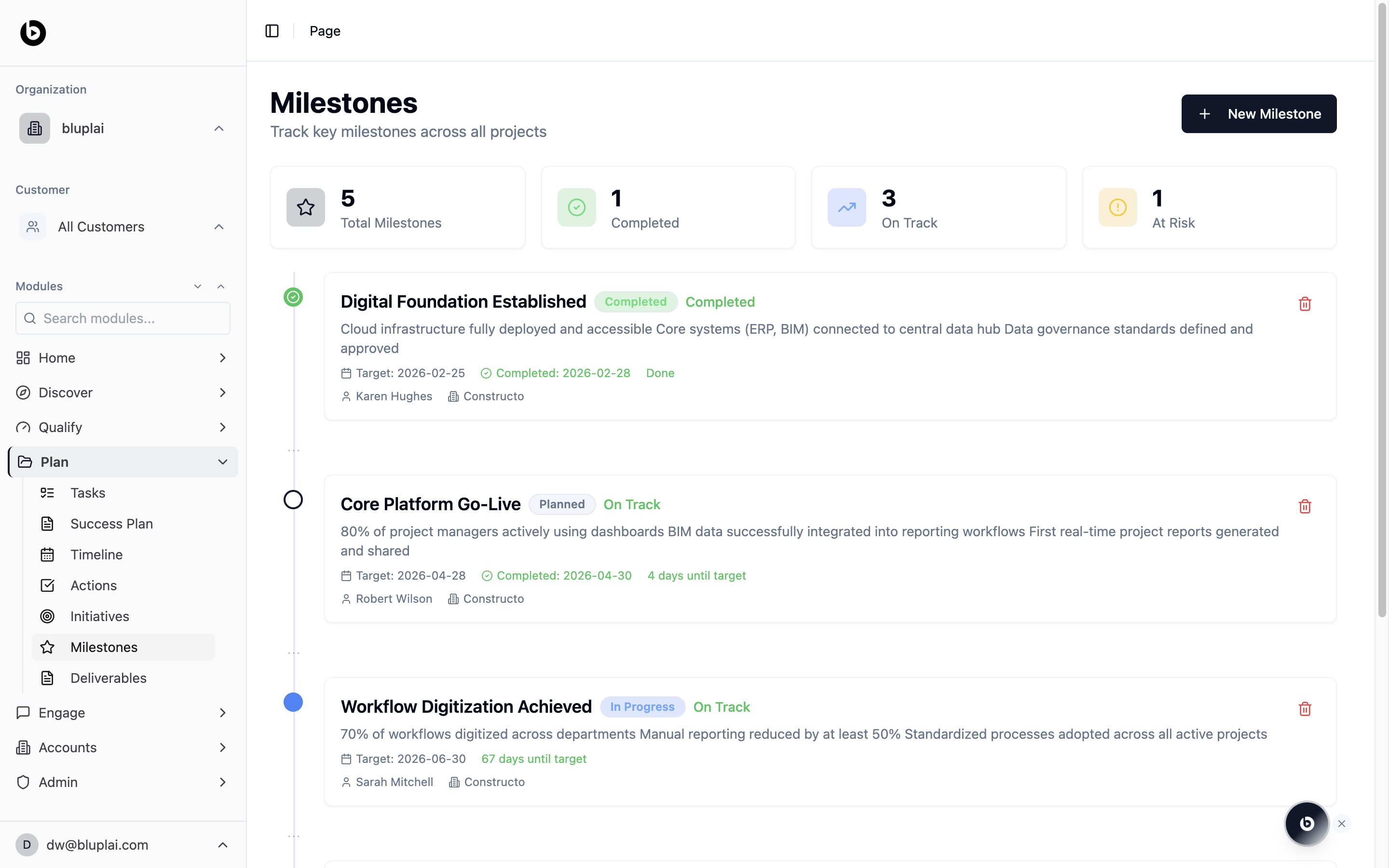 Milestones is a top-level page that lists every key checkpoint across all projects. Each milestone has a status (Planned, In Progress, Completed), a health indicator (for example, On Track, At Risk), a target date, an owner, and a customer. Use this as the cross-project heartbeat of delivery.When to use it