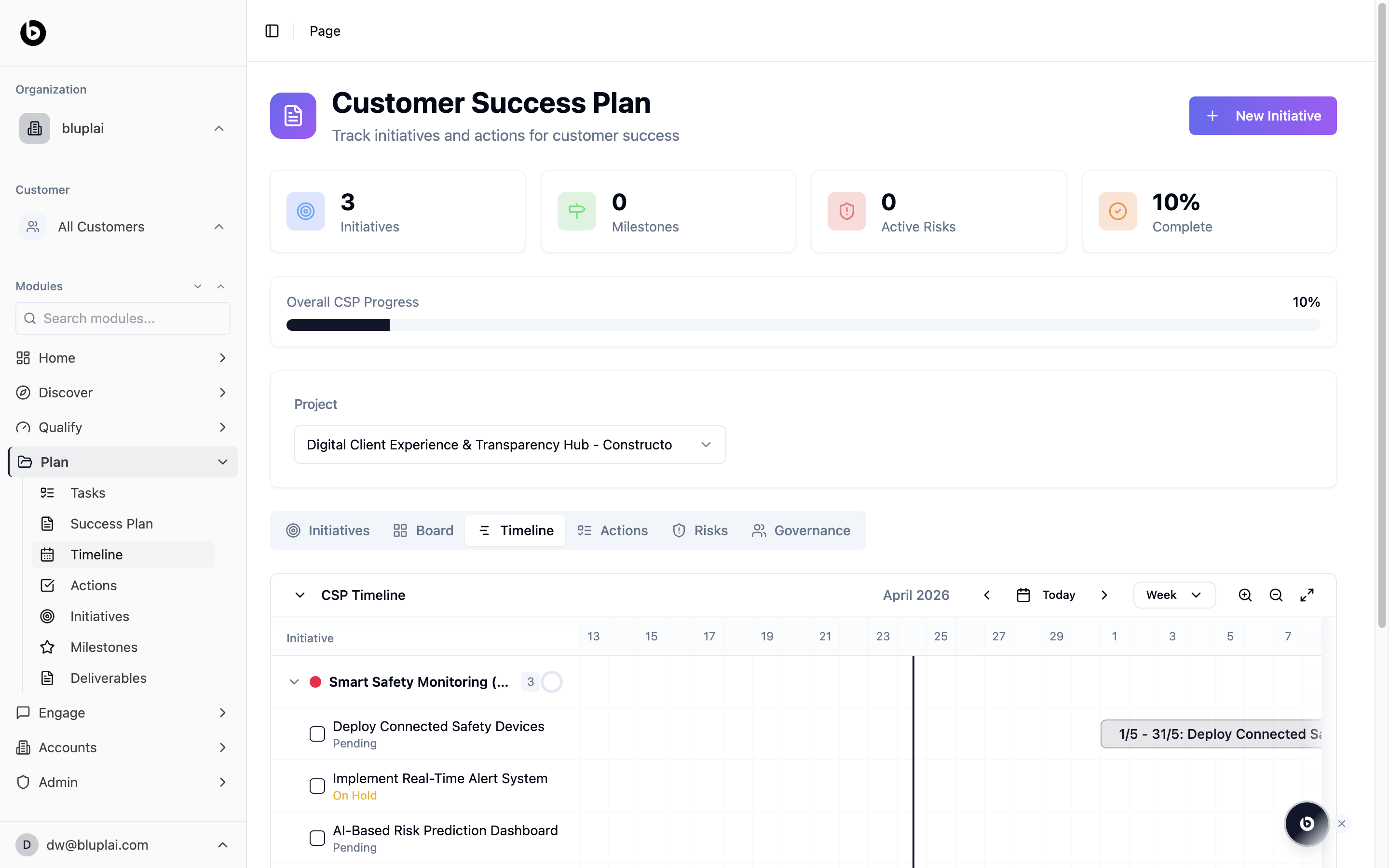 The schedule view of the Customer Success Plan. Gantt-style with initiatives on the y-axis and dates across the top. Use it for status calls and QBRs when visualizing sequencing, overlaps, and dependencies matters more than a flat list.What it is