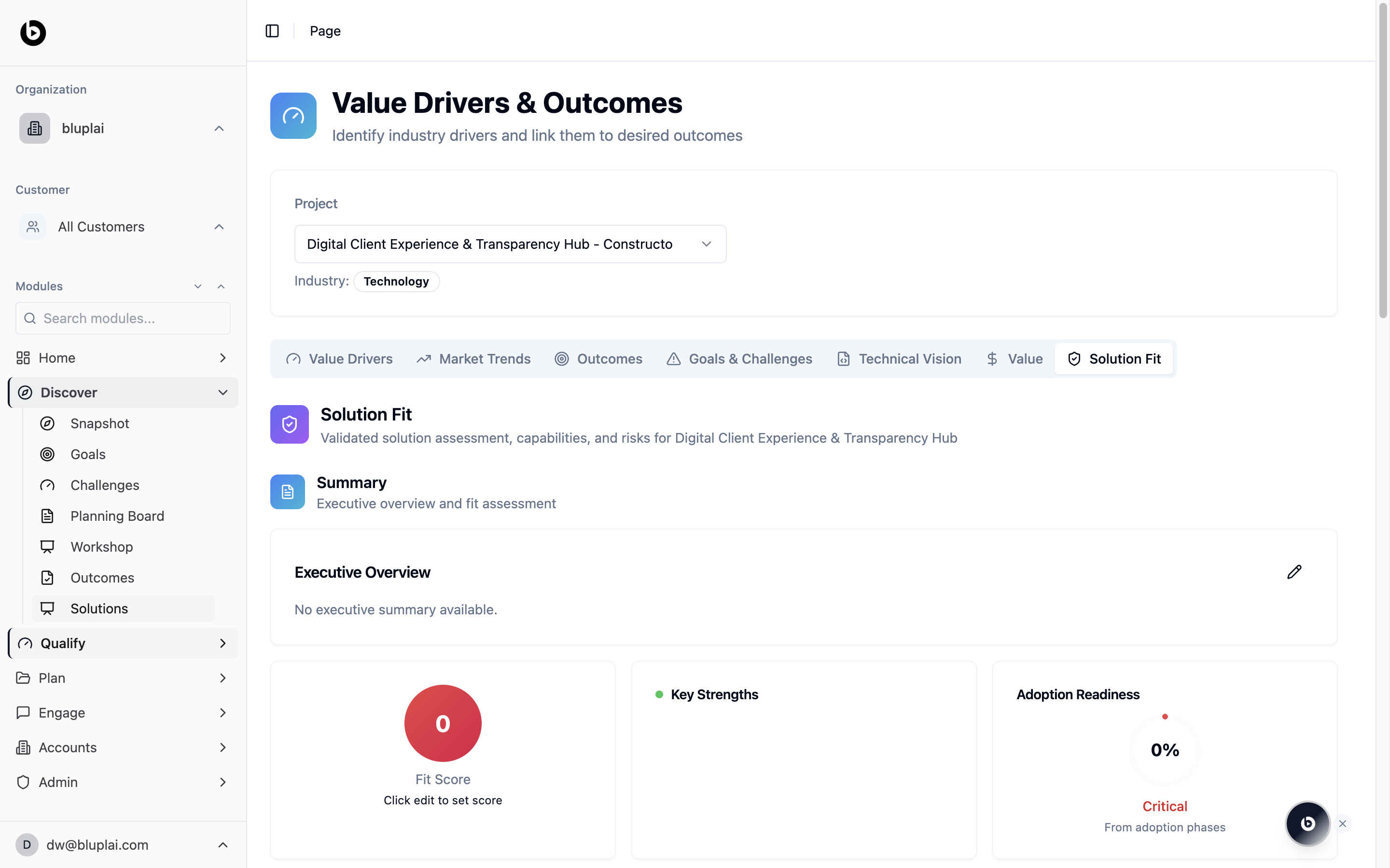 /drivers?tab=solution-fit, click the edit icon on the Executive Overview card to start populating the summary.Fill in the details