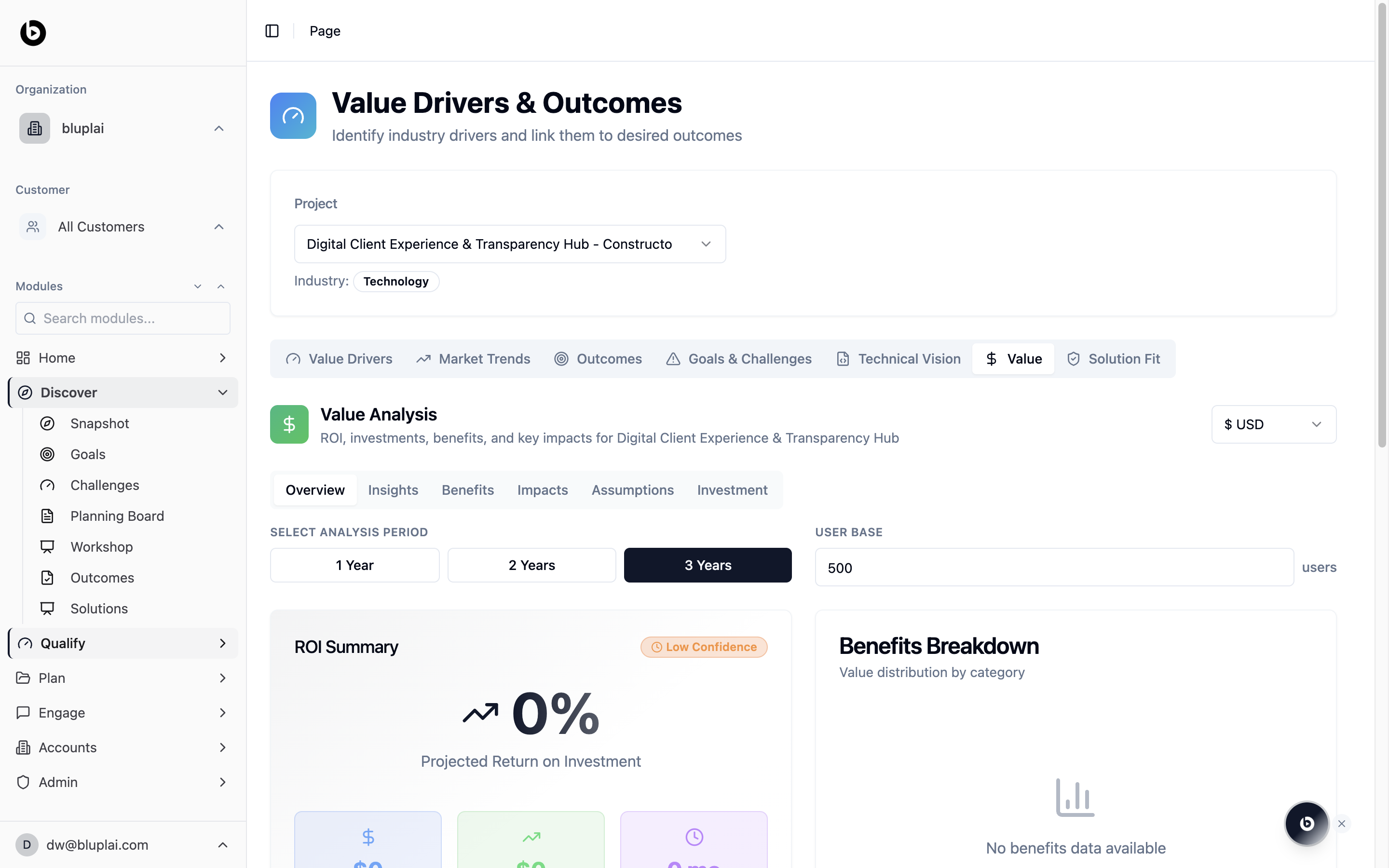 - ROI Summary — headline return on investment, flagged as Low Confidence and showing 0% projected return until you add benefits and investment data